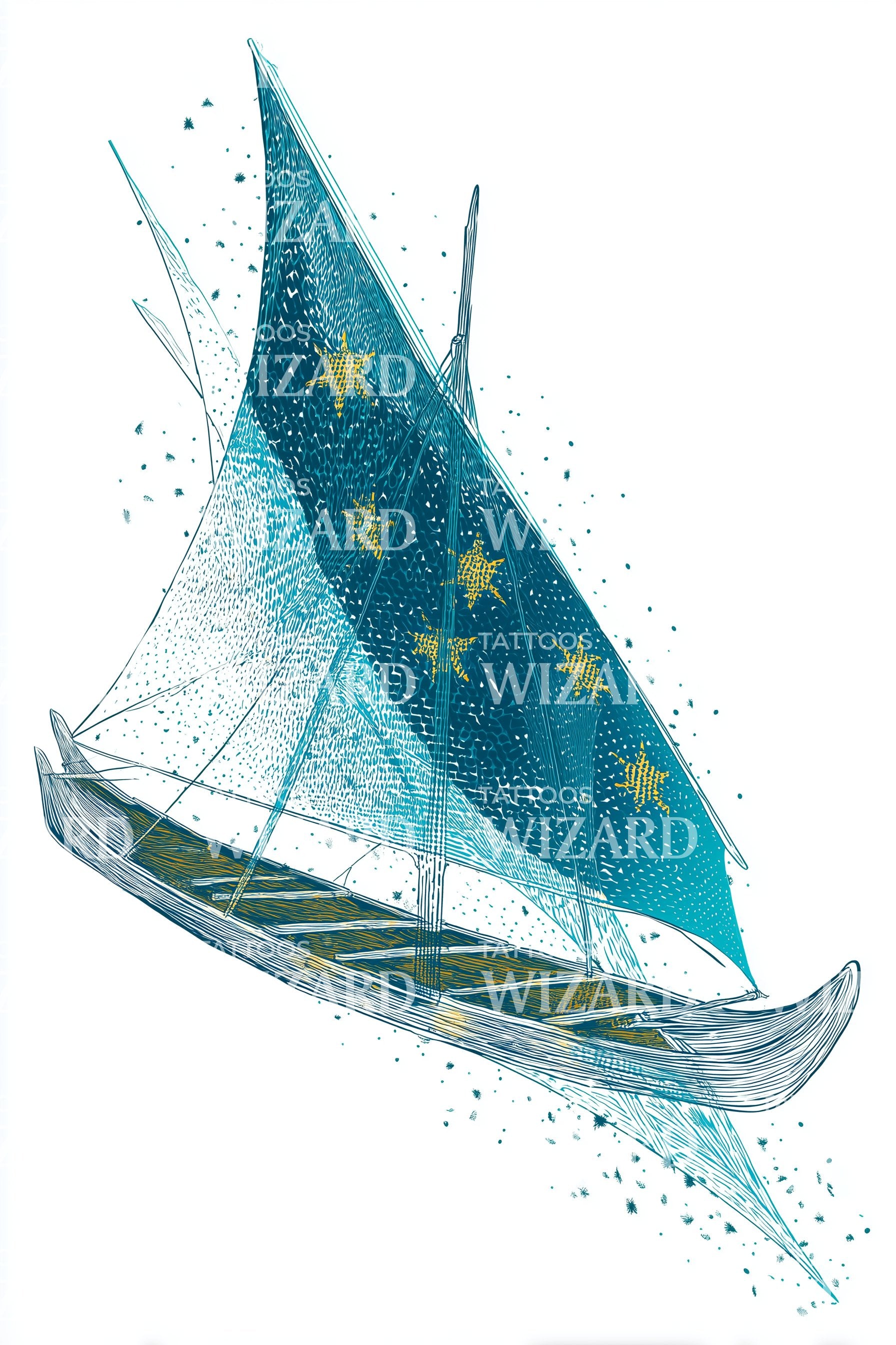 体验这款水彩纹身设计带来的冒险召唤。它描绘了一艘帆船驶向星光点缀的岛屿,体现了大海的迷人魅力。以不同蓝色调绘制,捕捉了航海旅程的神秘吸引力。是热爱海上冒险者的理想之选。