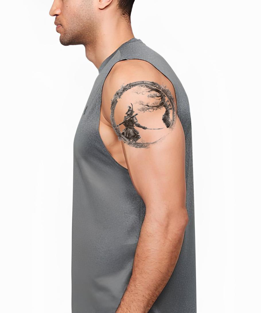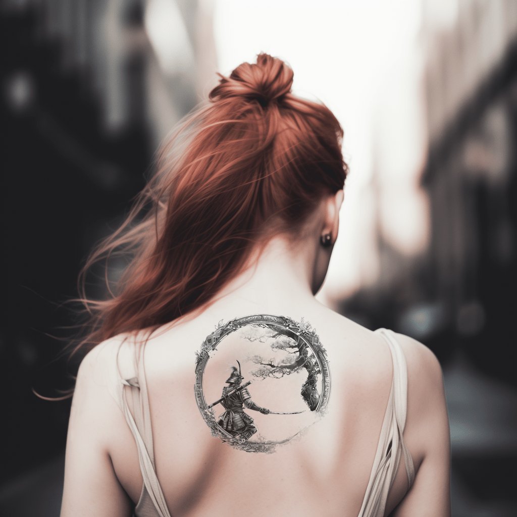 武士与树圆形框架纹身设计