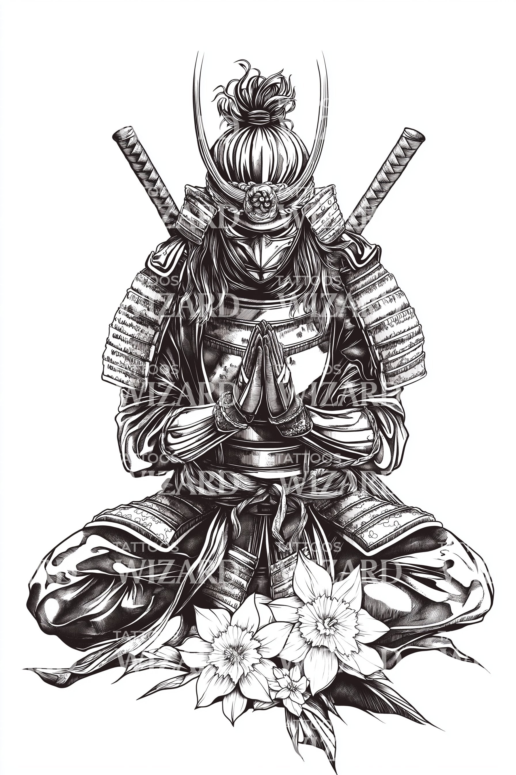 释放你内心的战士,这款大胆的黑灰色武士纹身设计。传统插画描绘了一位身着精致盔甲、点缀优雅花卉的武士。这个设计不仅仅是一幅图像,它体现了力量、勇气和日本传统之美。