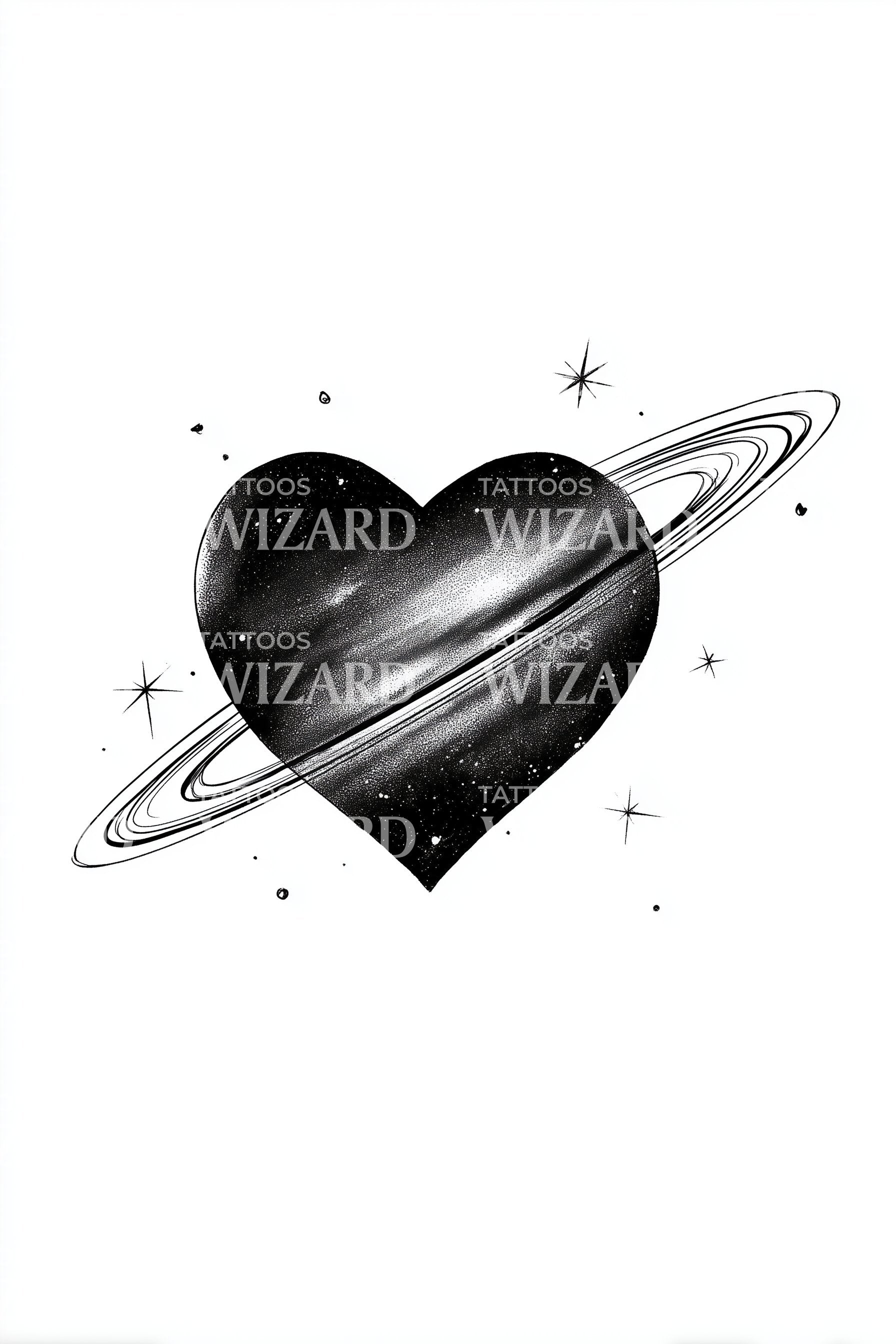 鲜明的黑色纹身心形托起一片光辉的银河,土星环穿过点点星辰,线条清晰,点状阴影柔和。象征着带有引力的爱,塑造世界并占据空间的浪漫。佩戴如同宇宙般的勇气。理想位置为胸骨、前臂、小腿或上背部,顺应自然曲线,居中流动。
