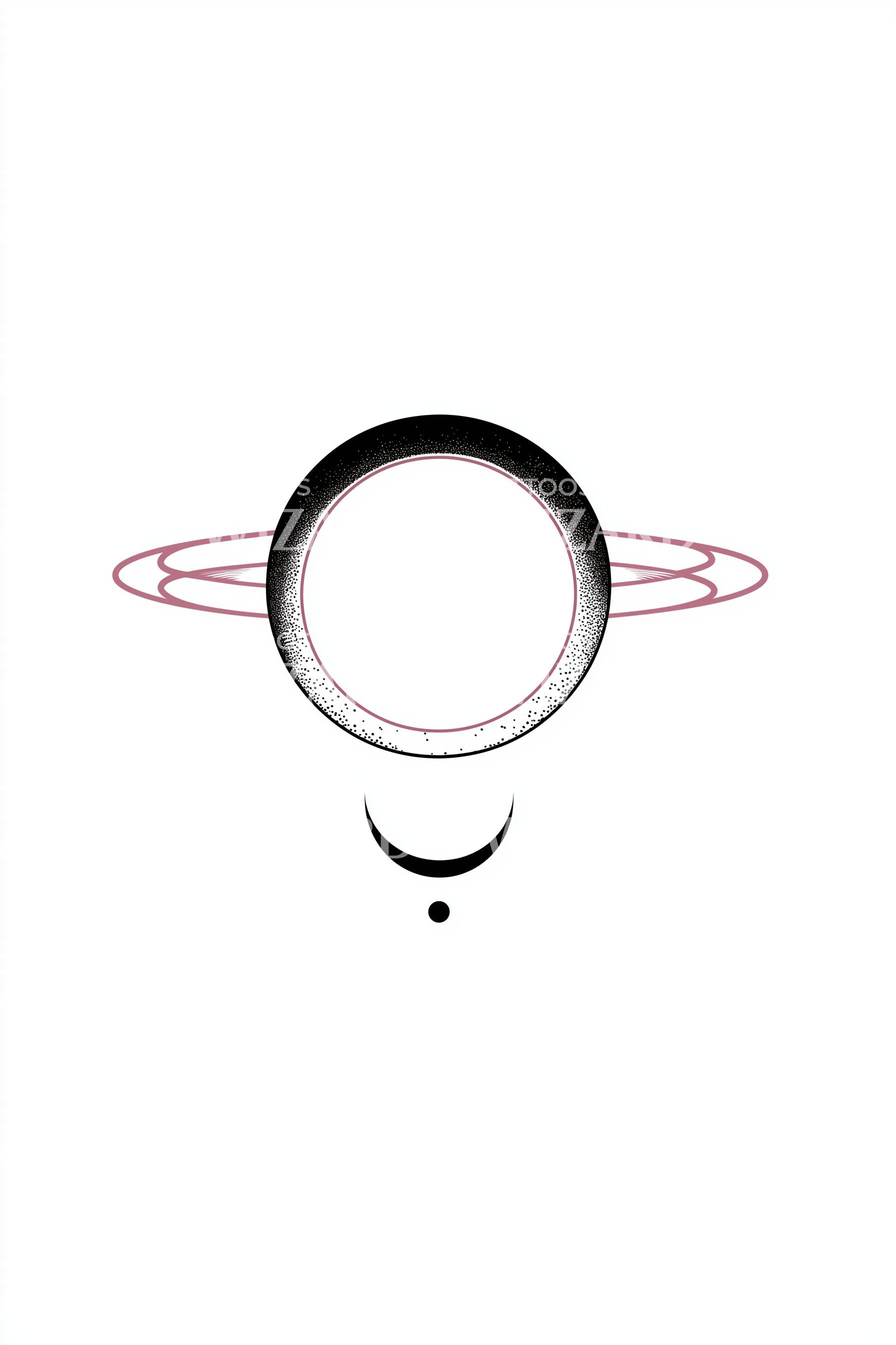 Geometric Saturn rises as a hollow orb, stippled halo and blush rings in clean orbit. A crescent and solitary dot anchor the cosmos below. Symbolizing discipline, cycles, and perspective, this design whispers of steady gravity and wonder, letting the wearer feel centered, timeless, and beautifully vast every day.