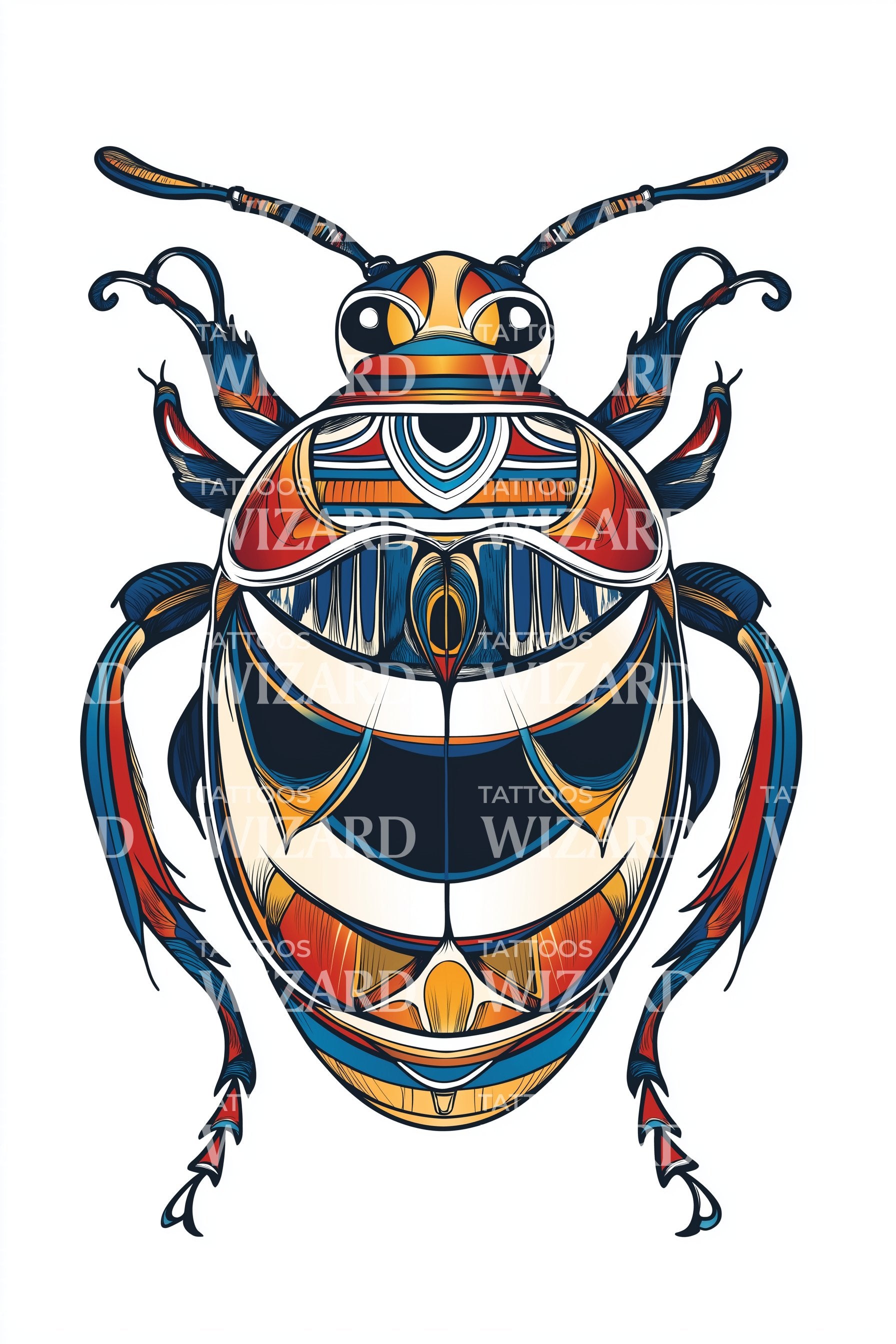 Jewel-toned neotraditional scarab, plated in blue, red, and gold, reads like Egyptian armor, with clean linework and strong panels. Symbol of rebirth, protection, and sovereign will, it steadies the heart in calm. Ideal placements: sternum for symmetry, forearm for flow, upper back for grandeur, calf for vertical strength.