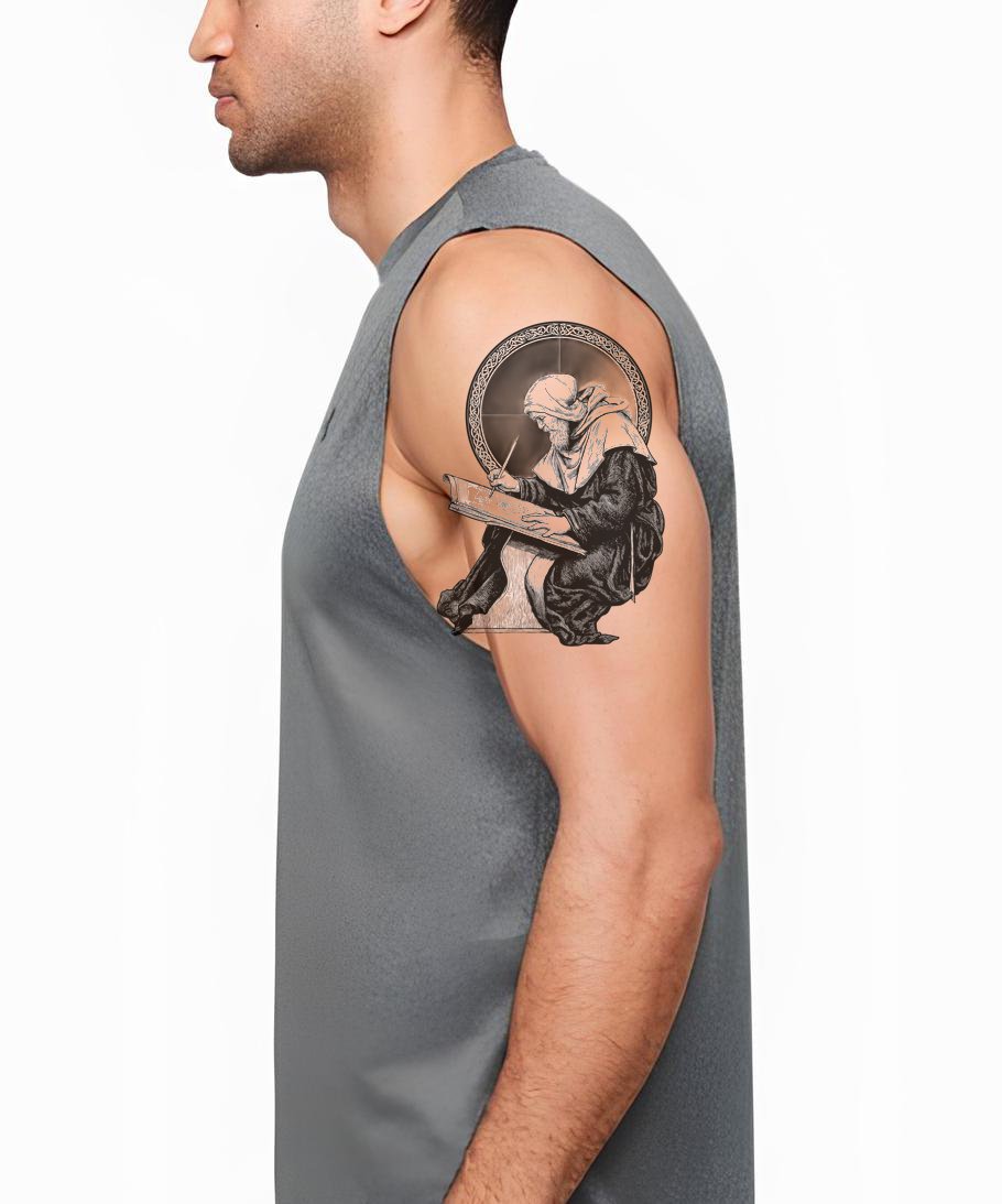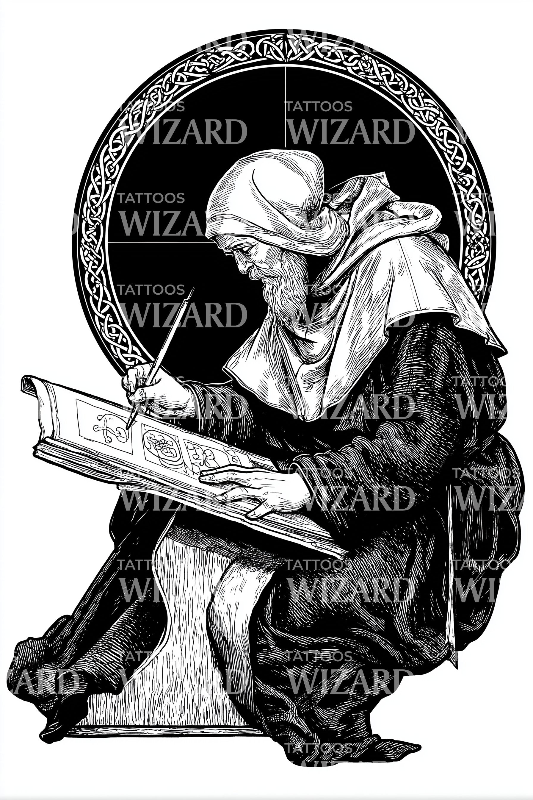 体验这款非凡黑灰纹身设计中蕴含的深邃知识。精心雕琢,描绘了一位中世纪僧侣,沉浸于学术阅读,象征智慧与丰硕的学问。这是对智力追求的绝佳颂歌,完美契合终身学习的信仰者。