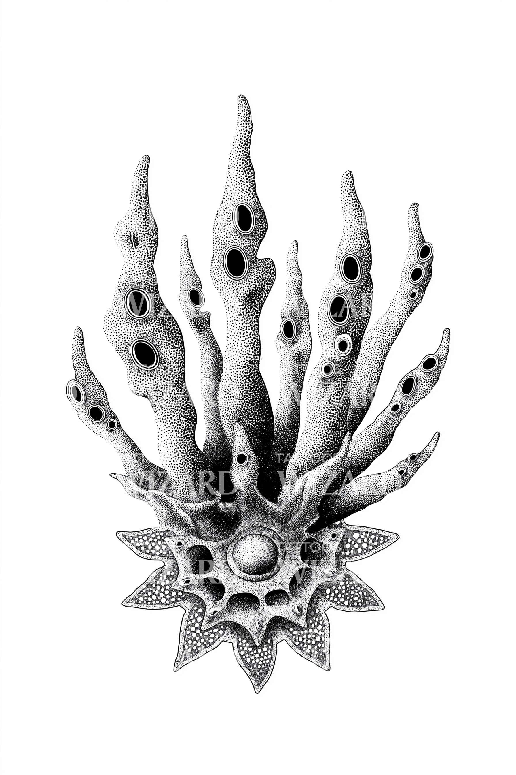 For the ones who survive by becoming shelter. A marine sponge rising from the reef, dotwork texture like patient breath through pressure, turning every scar into habitat. You claim a quiet strength that filters chaos into clarity. In the ocean’s hush, you learn to bloom porous.