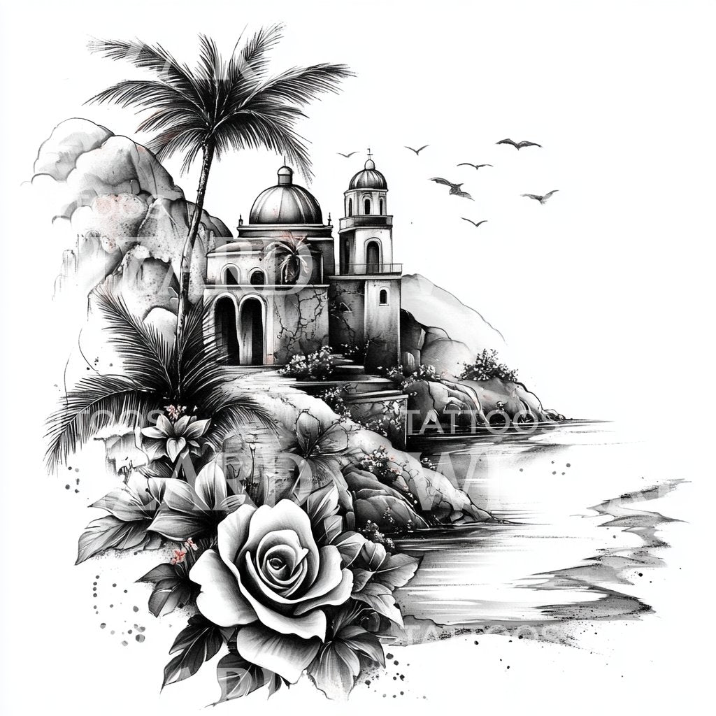 沉浸在这个黑灰色纹身设计所描绘的宁静浪漫的风景中。设计完美地刺绣出一座海边的风景教堂,周围环绕着郁郁葱葱的棕榈树和精致的花朵。这幅如画的作品不仅仅是纹身;它是对爱与宁静的精美叙述。