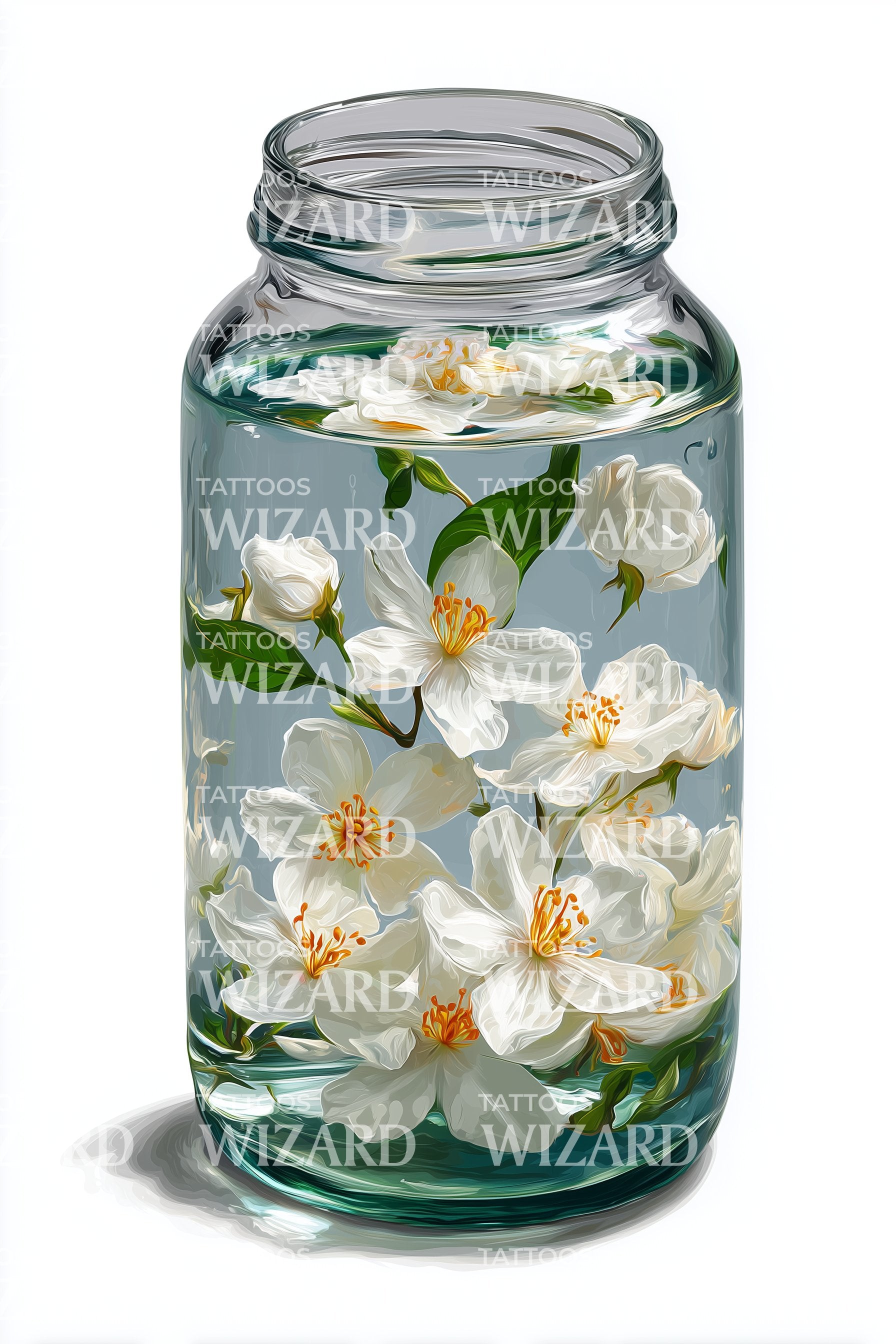 沉浸于我们逼真的水生静物纹身设计的宁静之中。这款设计捕捉了宁静的氛围,描绘了一罐华丽的花卉,展现出水生元素,仿佛将你带入一个平静祥和的水下花园。这是一段用墨水刻画的优雅现实主义故事。