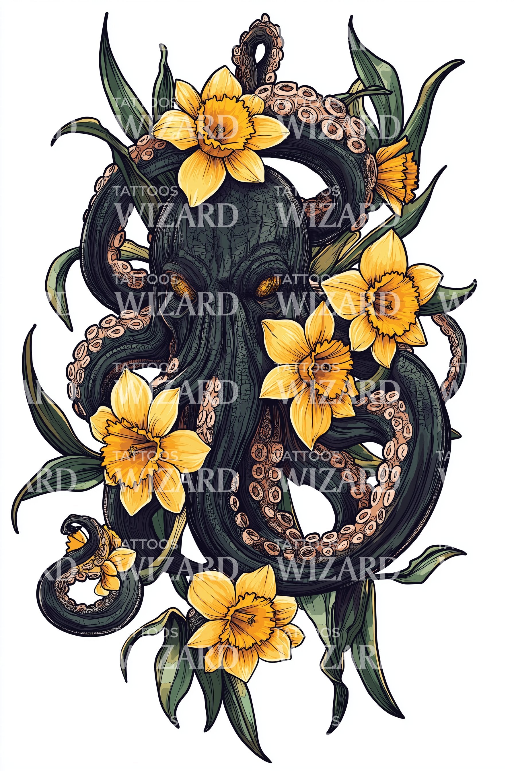 这款新传统纹身设计巧妙地融合了大自然的狂野魅力与艺术。它描绘了一条精细盘绕的蛇,缠绕在鲜艳的水仙花上。蛇与花朵之间鲜明的对比突显了它们原始而自然的美,营造出引人入胜的视觉效果。