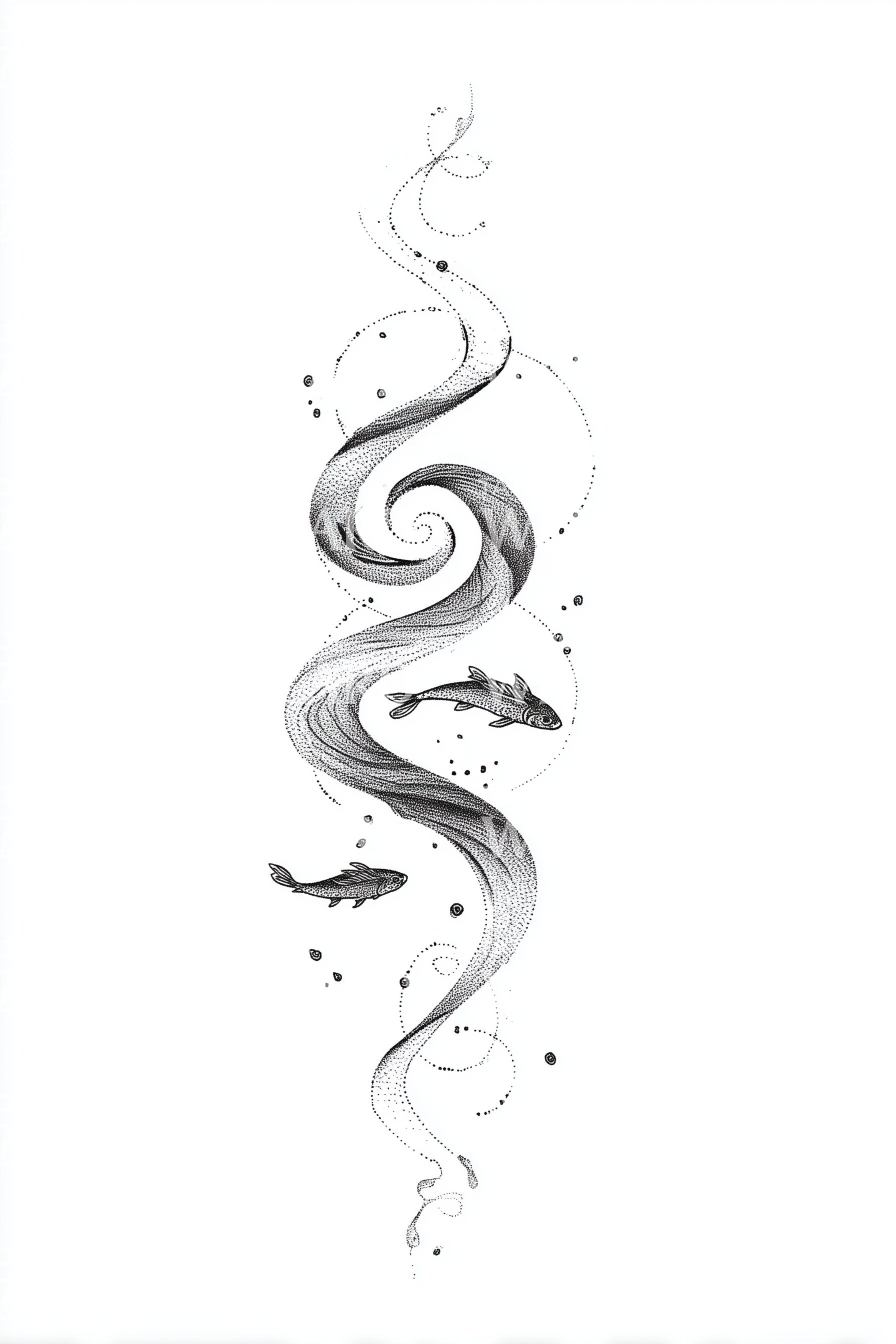 细线旋涡螺旋上升,如同一条由点和柔和阴影组成的蛇形卷轴,鱼群如护符般环绕其间。这个图腾传递水的力量,唤醒潜藏的能量与魔法。佩戴者感受流动与保护。适合位置:脊柱以体现中心流动,前臂展现优雅的长度,小腿表现垂直漂移,肋骨区配合呼吸节奏的律动。