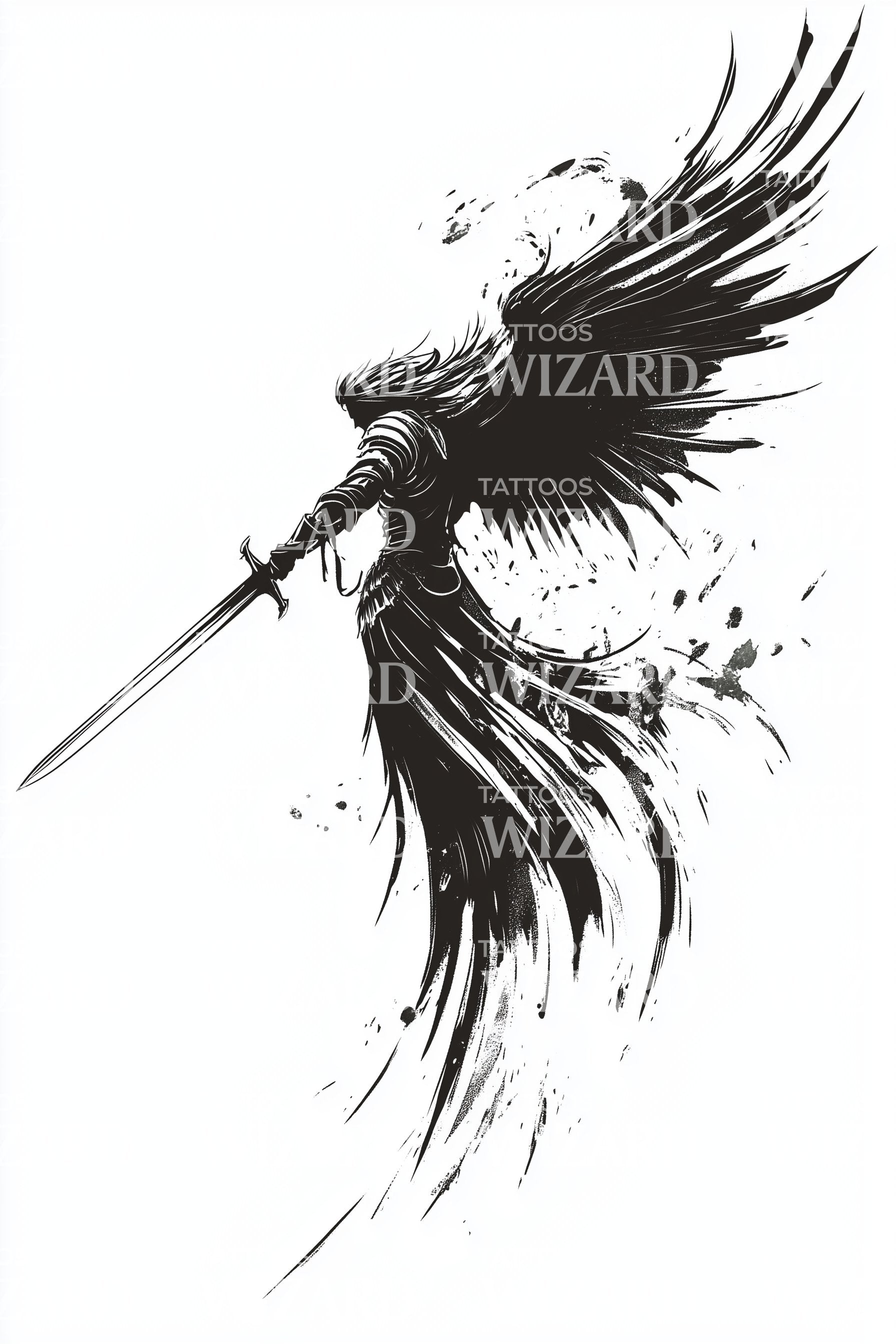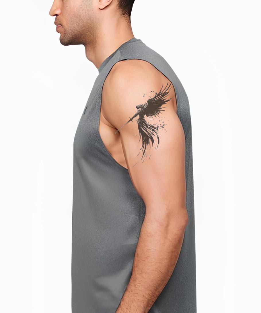 沉醉于这款黑灰纹身设计的神秘魅力。它艺术性地展现了一位威严的天使战士,挥舞着一把缠绕着阴影的雄伟长剑。战斗的动态精神在每一个细节中得以完美呈现,从精细雕刻的翅膀到坚定有力的战士姿态。