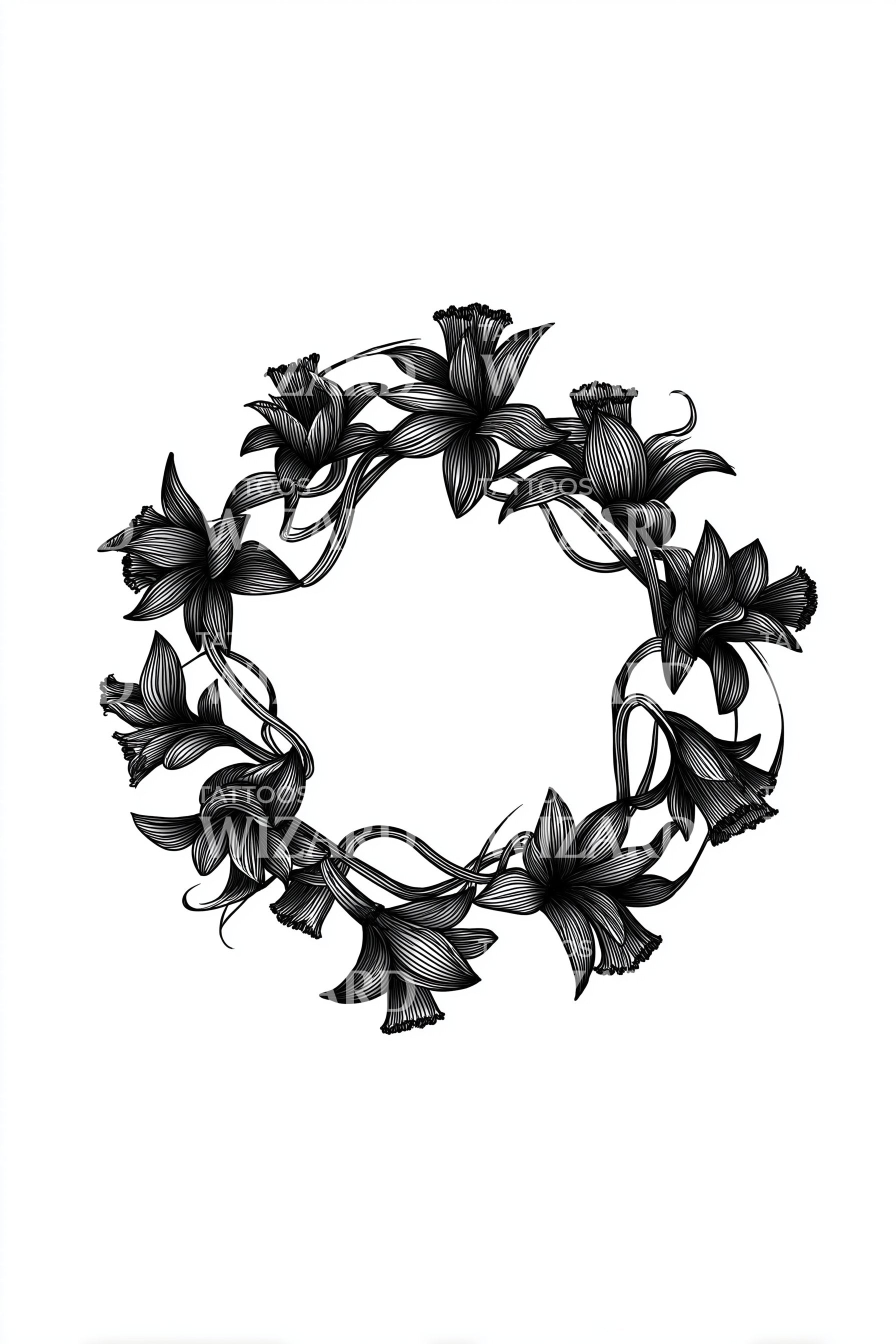 踏入植物美学的黑暗魅力,感受我们的花环纹身设计。采用引人注目的黑色工艺,设计的圆形构图环绕着黑暗而精致的植物,展现出迷人的风采。这是一件引人入胜的作品,将大自然的魅力与个性的深度巧妙交织。