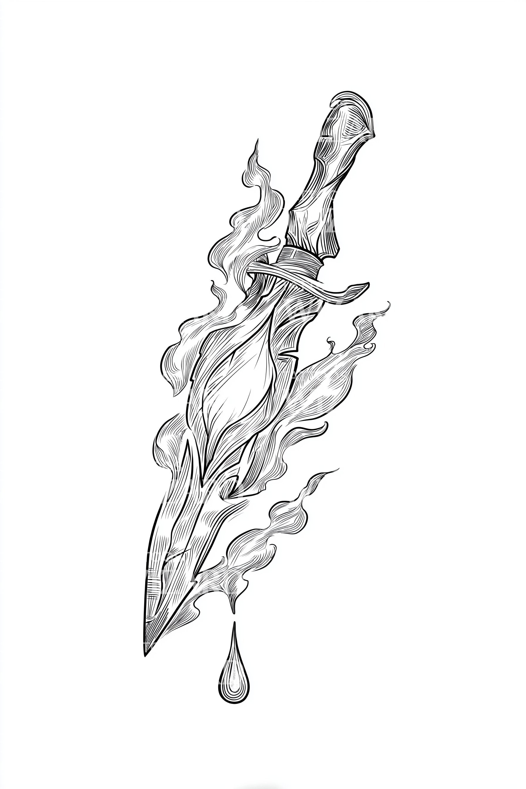 敢于与众不同,这款抽象纹身设计。融合燃烧匕首的强烈象征意义,这幅素描散发出凶猛与独特的气息。破碎武器的鲜明线条与抽象火焰交织,呈现出真正引人注目且令人敬畏的美感。现在就点燃你的肌肤吧!