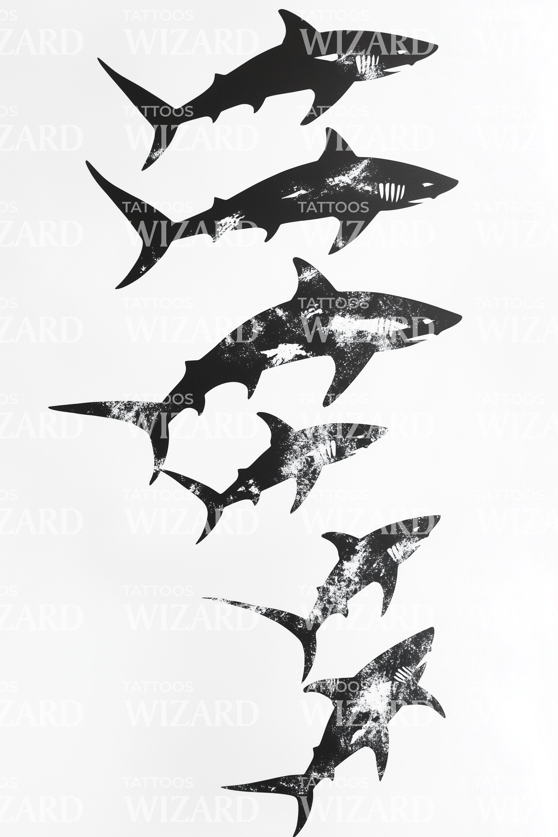 沉浸于这款精致的黑灰纹身设计所展现的水下世界。它巧妙地捕捉了一群鲨鱼在深海中游动的景象。作为对海洋生物的令人敬畏的描绘,这群鲨鱼象征着力量、自由以及探索广袤未知的渴望。