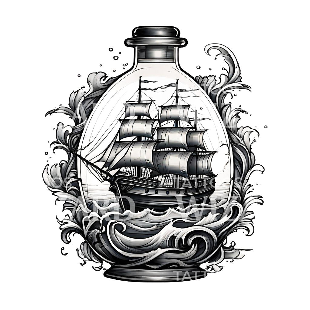 体验水手的魅力,尽在我们的新传统瓶中船纹身设计。由著名艺术家约翰创作,这件作品将古老的工艺与现代纹身感性完美结合。是任何纹身爱好者身体艺术收藏的完美补充。