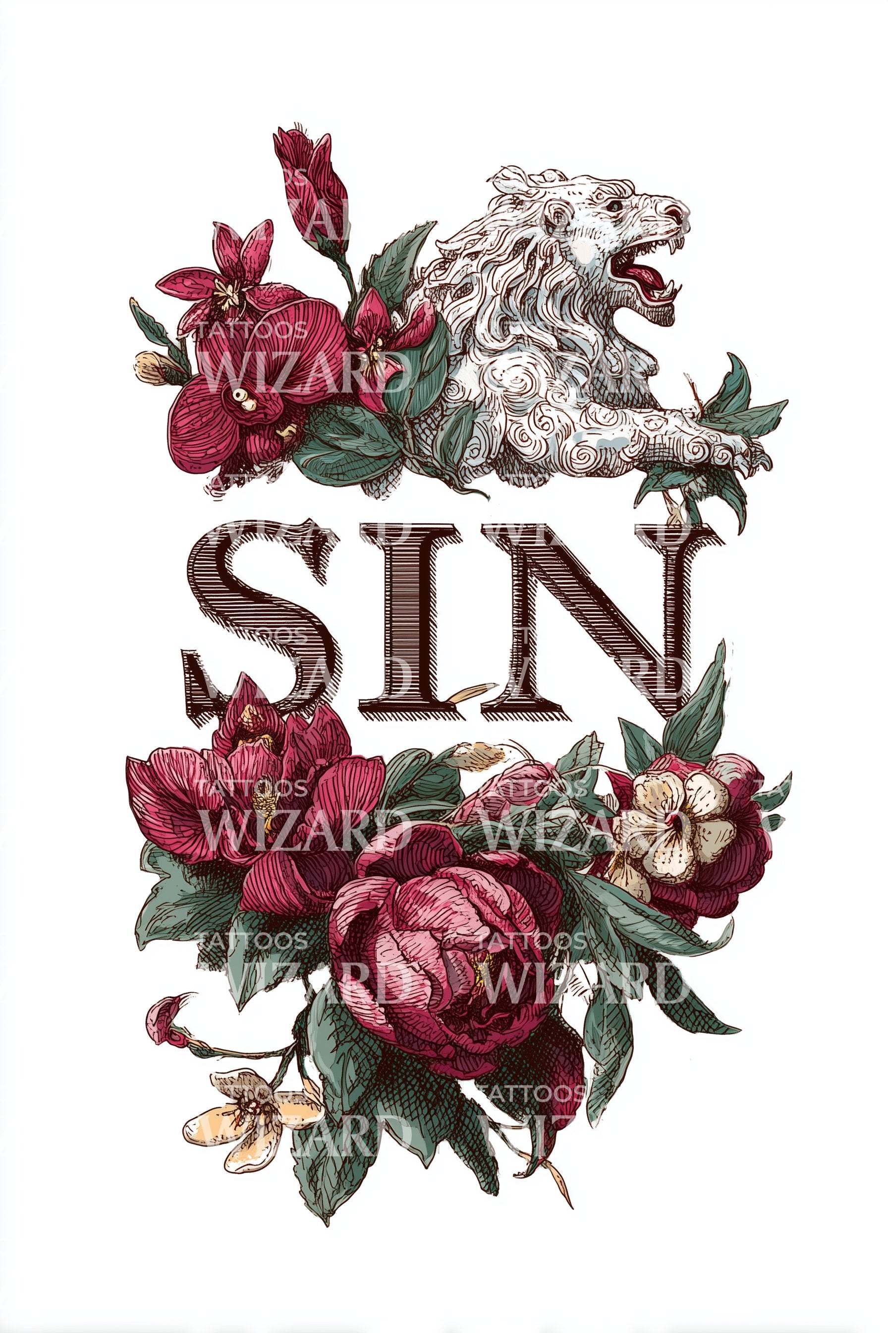 Ornamental crest of Singapore spirit: a heraldic lion emerging among crimson roses and orchid sprays, the engraved SIN script cradled in lush greenery. Symbolizes courage, growth, and proud roots. Worn on skin, it feels regal, botanical, and fiercely tender, a personal emblem of blooming resilience, heritage and wanderlust.