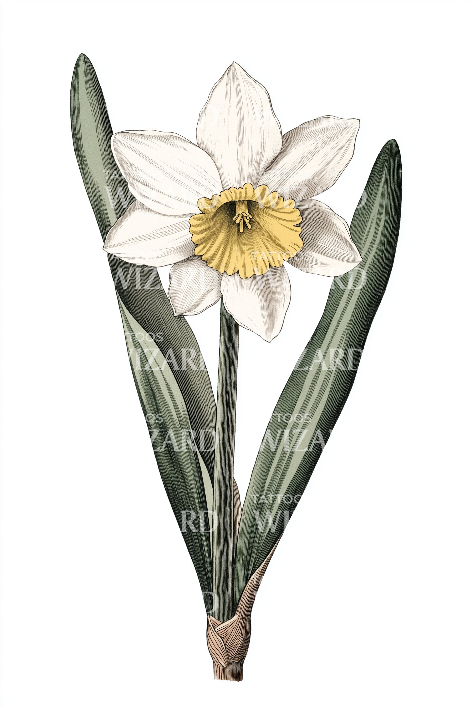 沉醉于这款逼真植物纹身设计的惊艳之美。它巧妙地捕捉了水仙花的细腻魅力,将花茎与花朵完美融合,呈现出生动逼真的形态。这件以自然为灵感的作品,是花卉写实纹身艺术复杂魅力的见证。