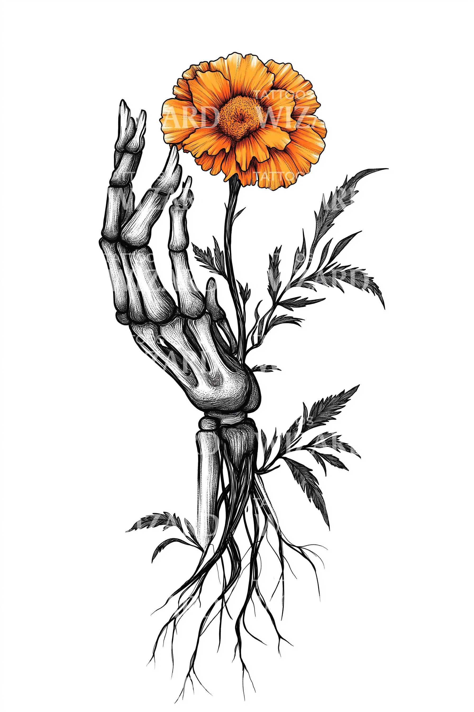 释放你内心的黑暗面,这款插画风格的纹身设计深入探讨了生与死的引人入胜的对比,描绘了从骷髅手中生长出的鲜艳万寿菊。这是对死亡之美的震撼诠释,是钟情于阴森风格者的独特之选。