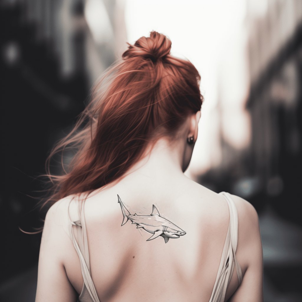 沉浸在海洋深处,欣赏这款复杂的黑灰色纹身设计。由纹身艺术家约翰创作,这件作品将几何形状与鲨鱼的可怕美丽相结合。非常适合所有海洋和动物爱好者,想要炫耀一件独特的海洋艺术作品。