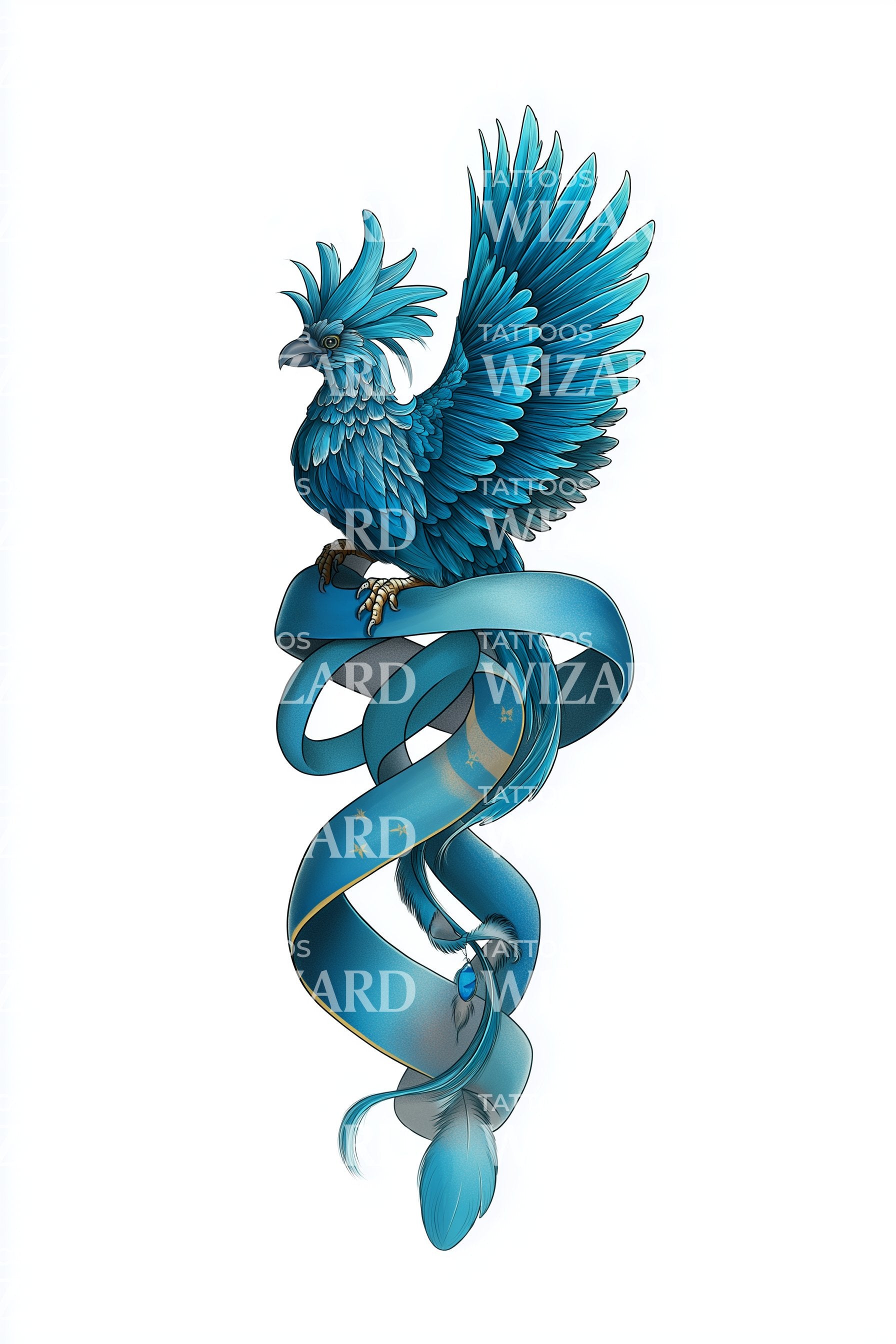一只富有表现力的凤凰翱翔在蔚蓝的天空中,呼应哈萨克斯坦的国旗和不屈的精神。金色阳光照耀的羽毛和展开的翅膀环抱着草原鹰图案和koshkar-muiz装饰,融合了重生与传承。粗犷的线条、明亮的蓝色和柔和的渐变营造出光辉、振奋且充满哈萨克自豪感的设计,象征着坚韧不拔。