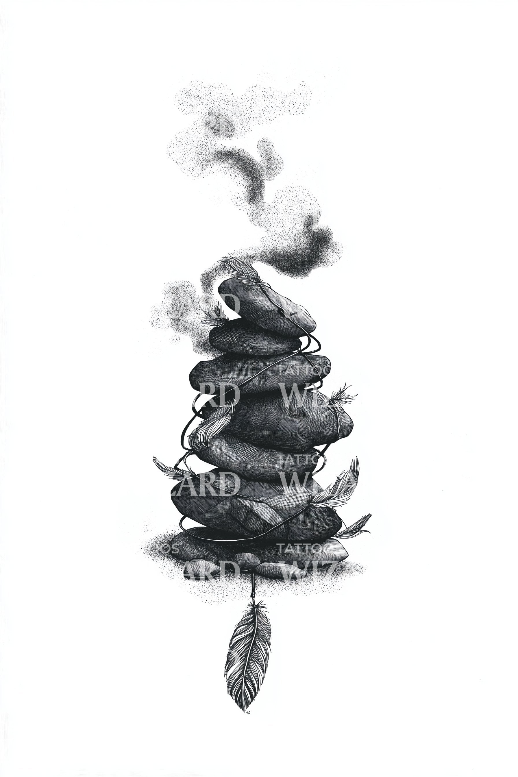 Black and grey dotwork stacks a cairn of river pebbles, wrapped in slender cords and drifting feathers as soft smoke curls upward. Each stone anchors intention, each feather whispers release. Balance meets breath, guiding quiet focus. Worn on skin, it invites grounded calm and enduring peace each day.
