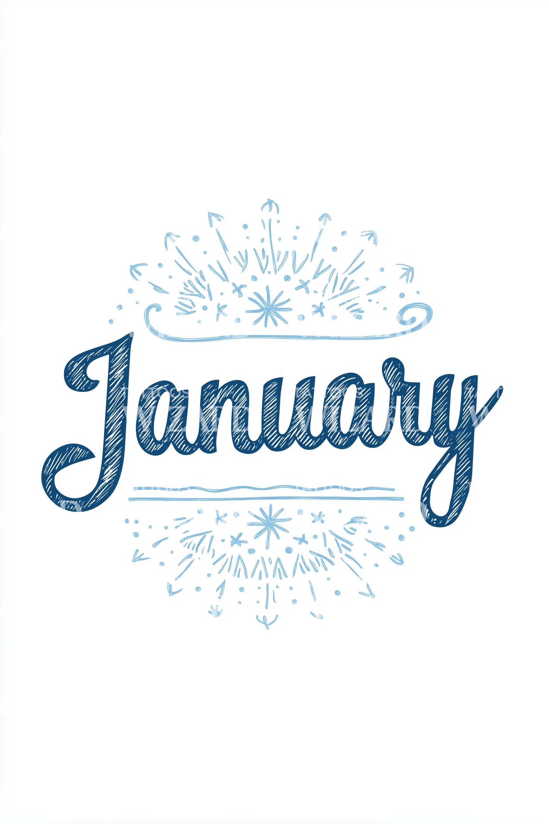 January written in deep blue watercolor script, framed by light snowflake bursts and delicate dots, like frost catching dawn. Symbol of clean beginnings, winter wisdom, and resilient calm. Wears like a quiet vow, cool and hopeful, inviting fresh chapters, breath-steady clarity, and softly falling courage through every season.