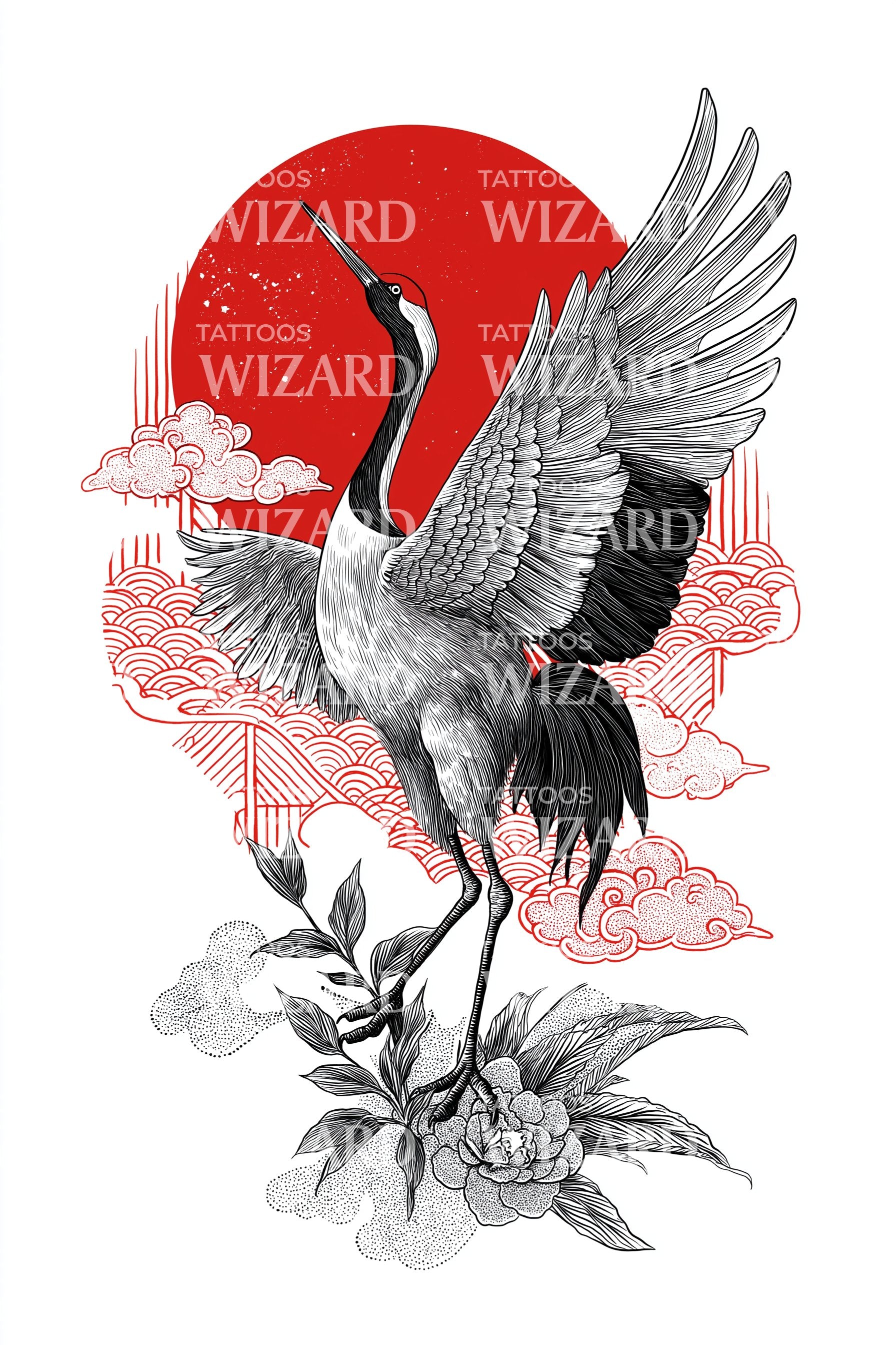 沉浸于日本艺术的宏伟之中,这款令人惊叹的纹身设计描绘了一只优雅的鹤在生动的日出天空中翱翔,象征着长寿与好运,散发出宁静的气息。这款纹身将把你的身体变成优雅的画布,展现你对美丽与自由的热爱。