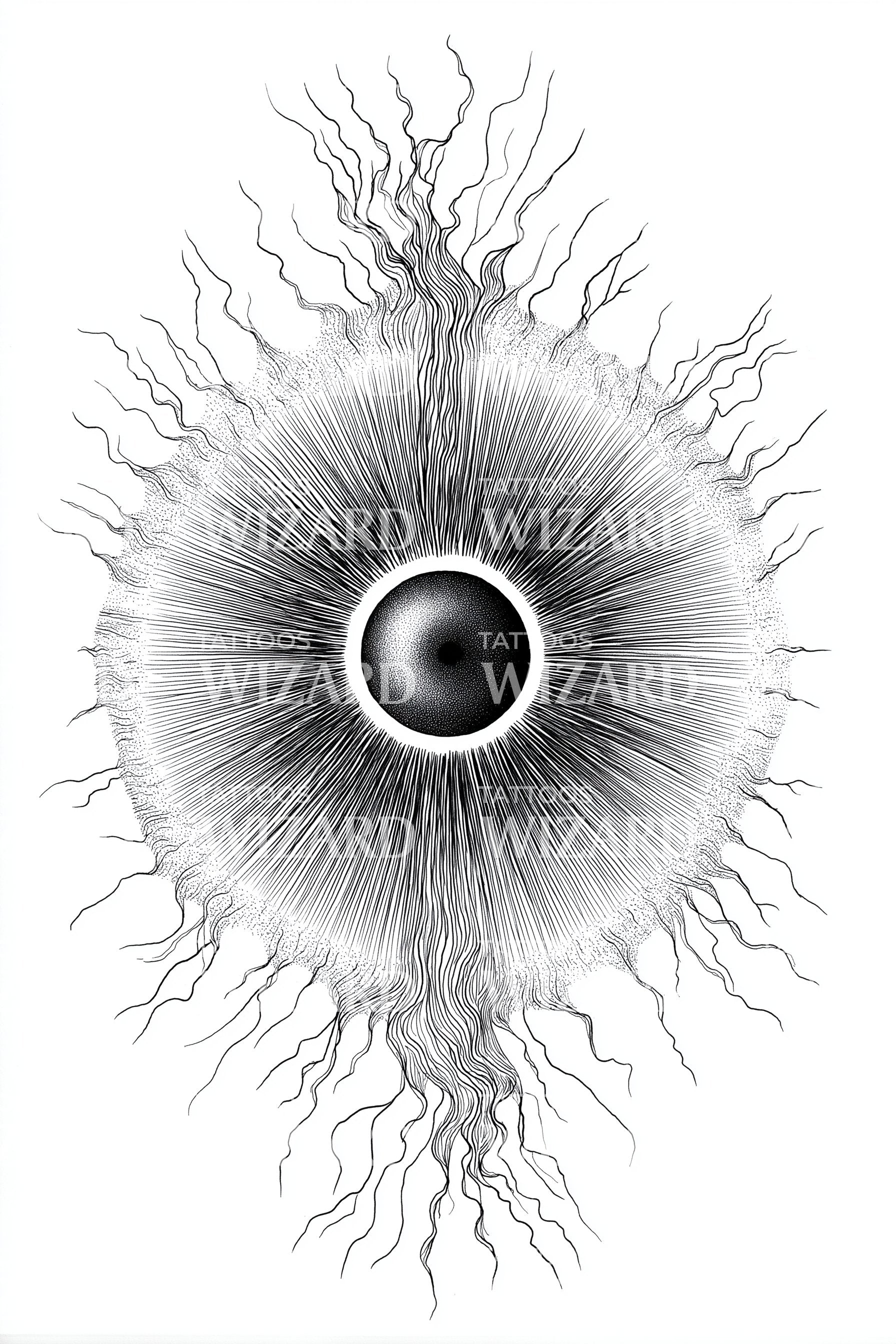 沉浸于这款点描纹身设计的宇宙之美。太阳光辉散发的耀眼能量与神秘的眼睛符号完美融合。此设计捕捉了光与宇宙之间的神秘联系,成为展现个人能量的华美象征声明。