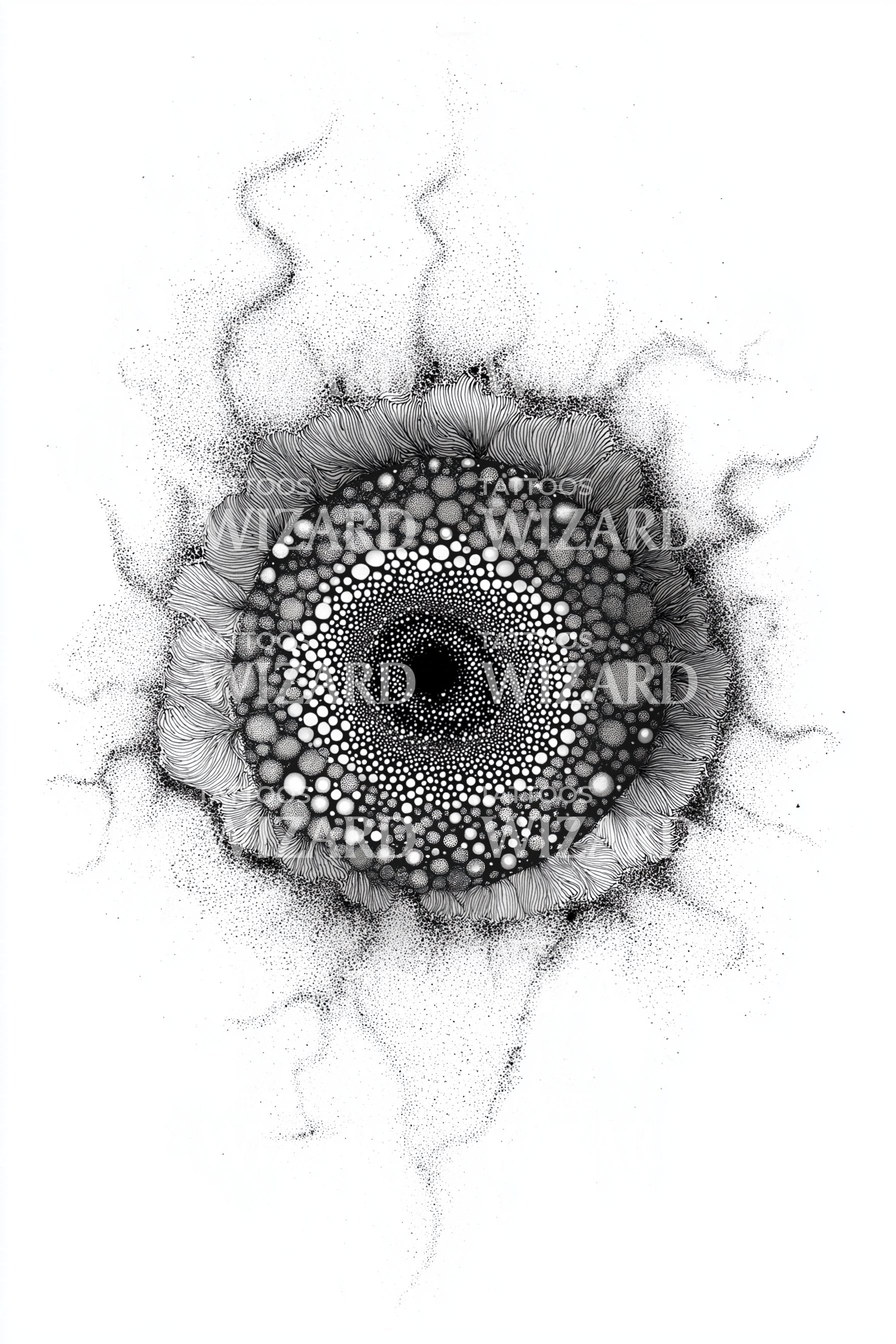 探索这款点描纹身设计带来的能量激增。迷人的曼陀罗自然融合入破碎的太阳眼图案,营造出令人着迷的效果。象征光与能量的相互作用,裂纹揭示了自然更深层次的奥秘。对于那些被天体神秘主义吸引的人来说,这是完美的作品。