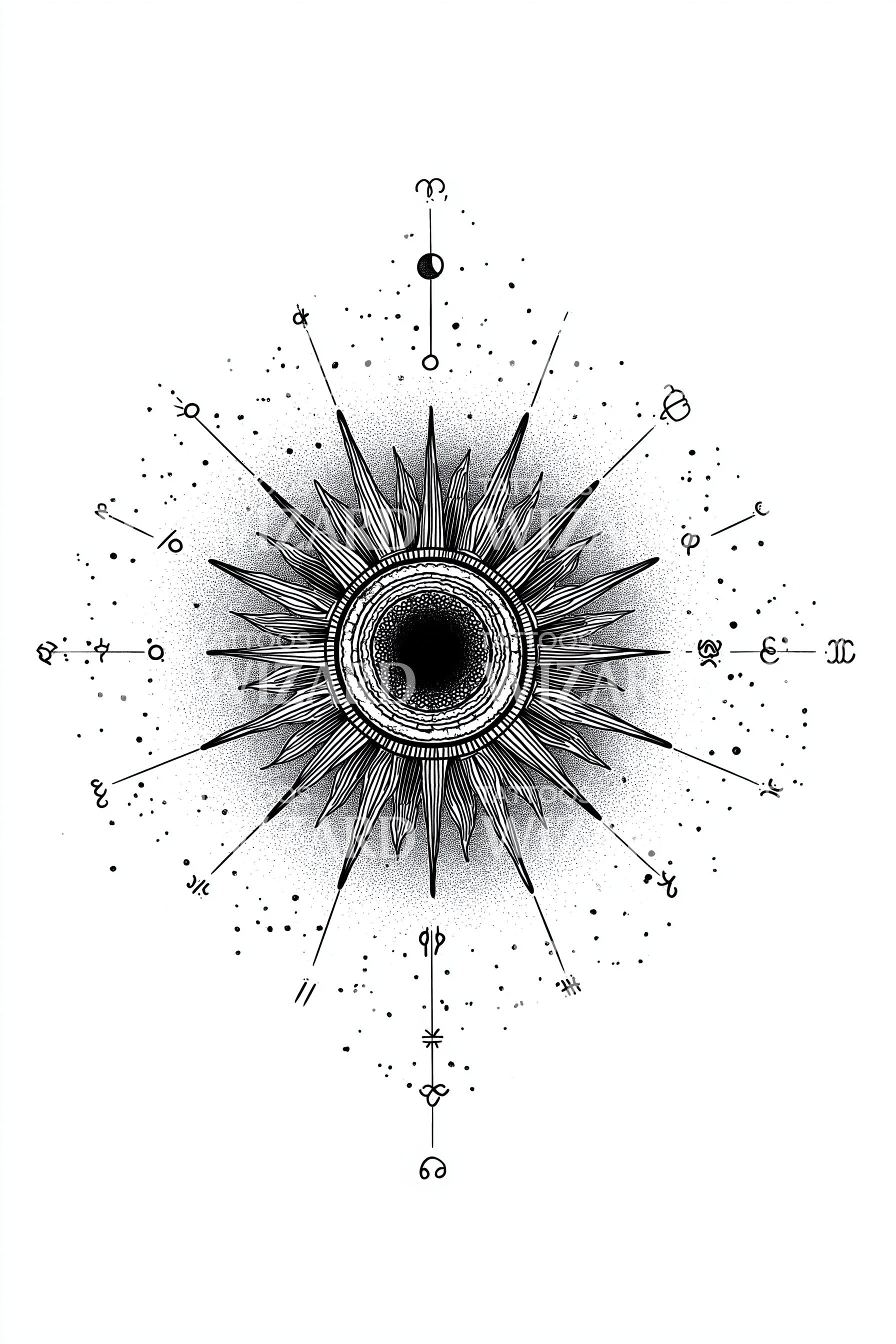 Solar mandala crowned with a fine-lined halo, spiked rays, and star-dusted dotwork. Zodiac sigils orbit like tiny ornaments, mapping a private cosmos. Symbolizes vitality, time, and centered purpose, the dark core holding luminous calm. Worn, it feels radiant yet grounded, a steady sun blessing daily journeys and awakenings.