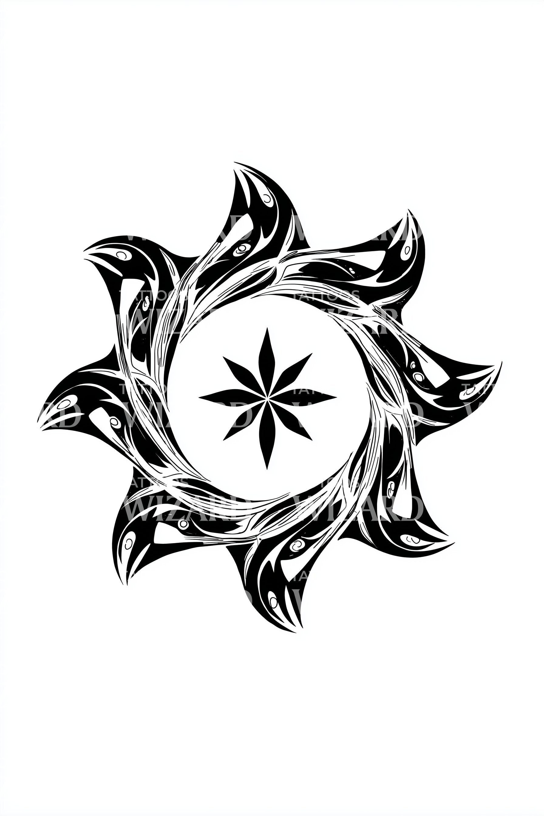 这款引人入胜的部落纹身设计将太阳和花环元素融合在一个和谐的日冕圆环中。以精细的黑色工艺呈现,这个设计散发出力量,象征着天体的坚韧。它是一件富有感染力的作品,非常适合钟情于大胆部落美学的你。