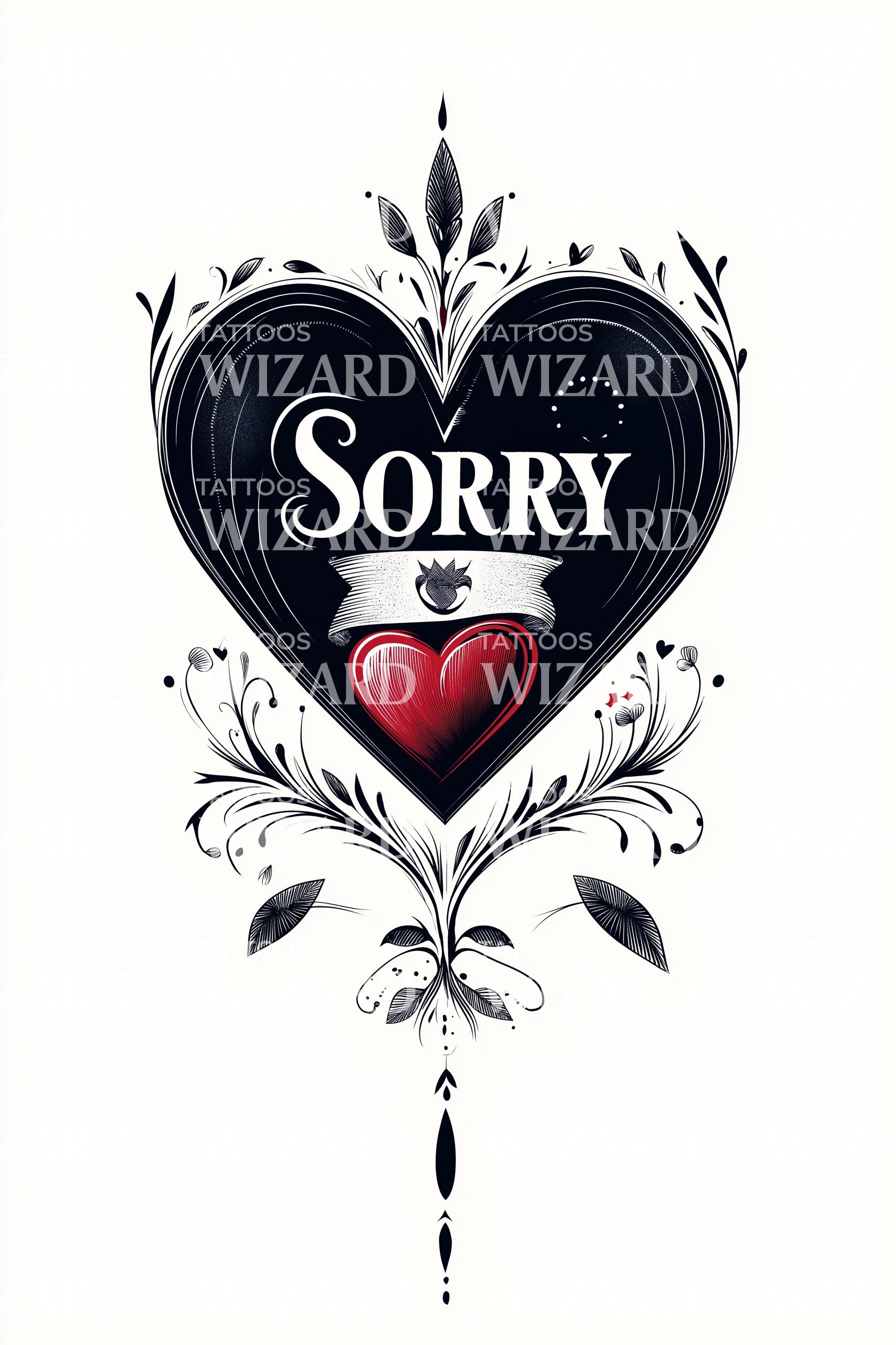 这款插画风格的纹身设计捕捉了深刻的情感与遗憾,提供了一种独特的方式来表达歉意。心形象征着爱,而以优雅字体刻写的“sorry”传达出真挚的心声。它是遗憾的美丽象征,也是对爱的坚韧不拔的深刻提醒。