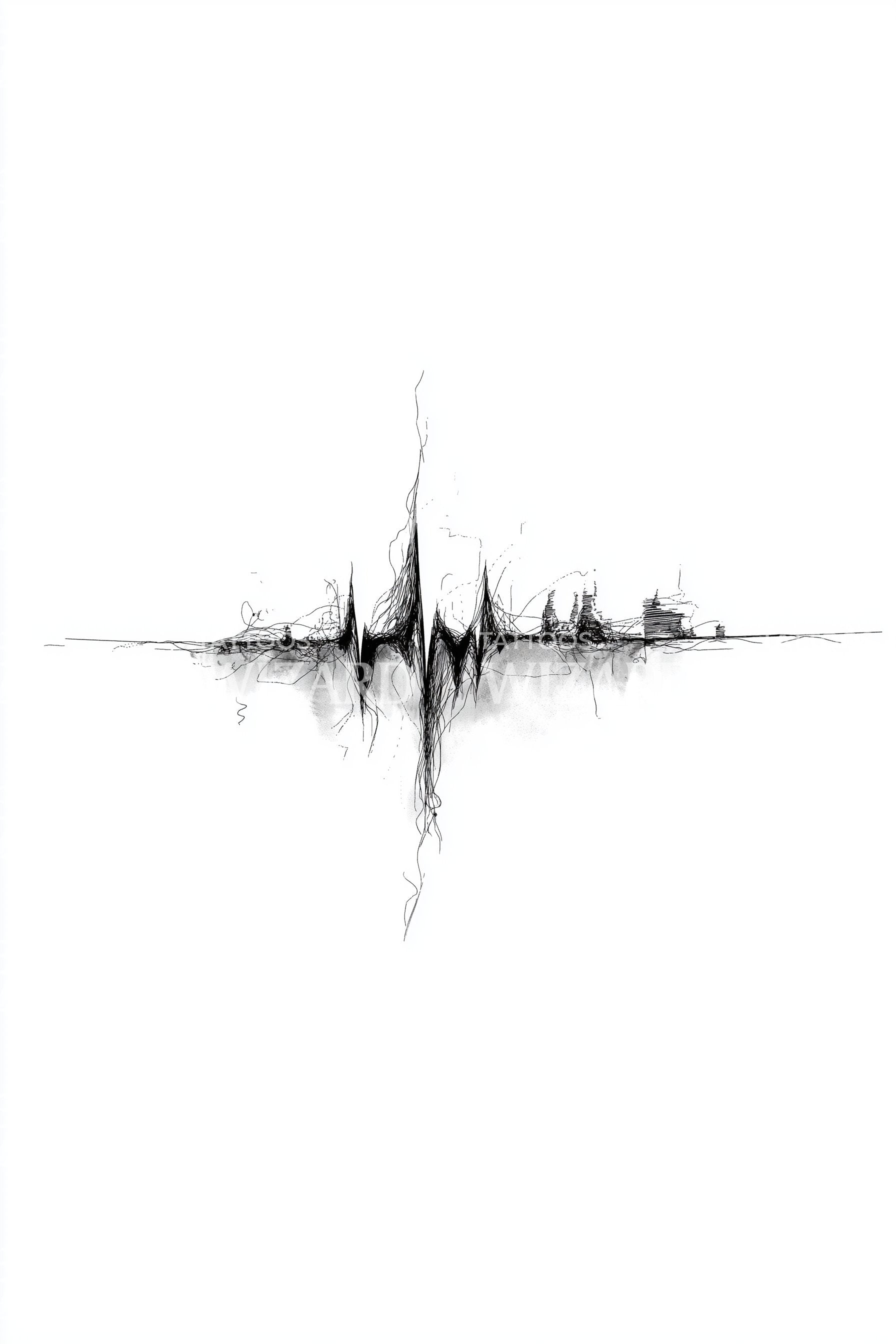 Signal drawn in ink: a razor-thin horizon with a mirrored waveform rising to a sharp peak, whispering of skyline and static. Minimal lines hold maximal breath. A symbol of sound becoming self, rhythm finding purpose. Wearing it feels like calm momentum, a clean, private pulse, steady, living frequency.