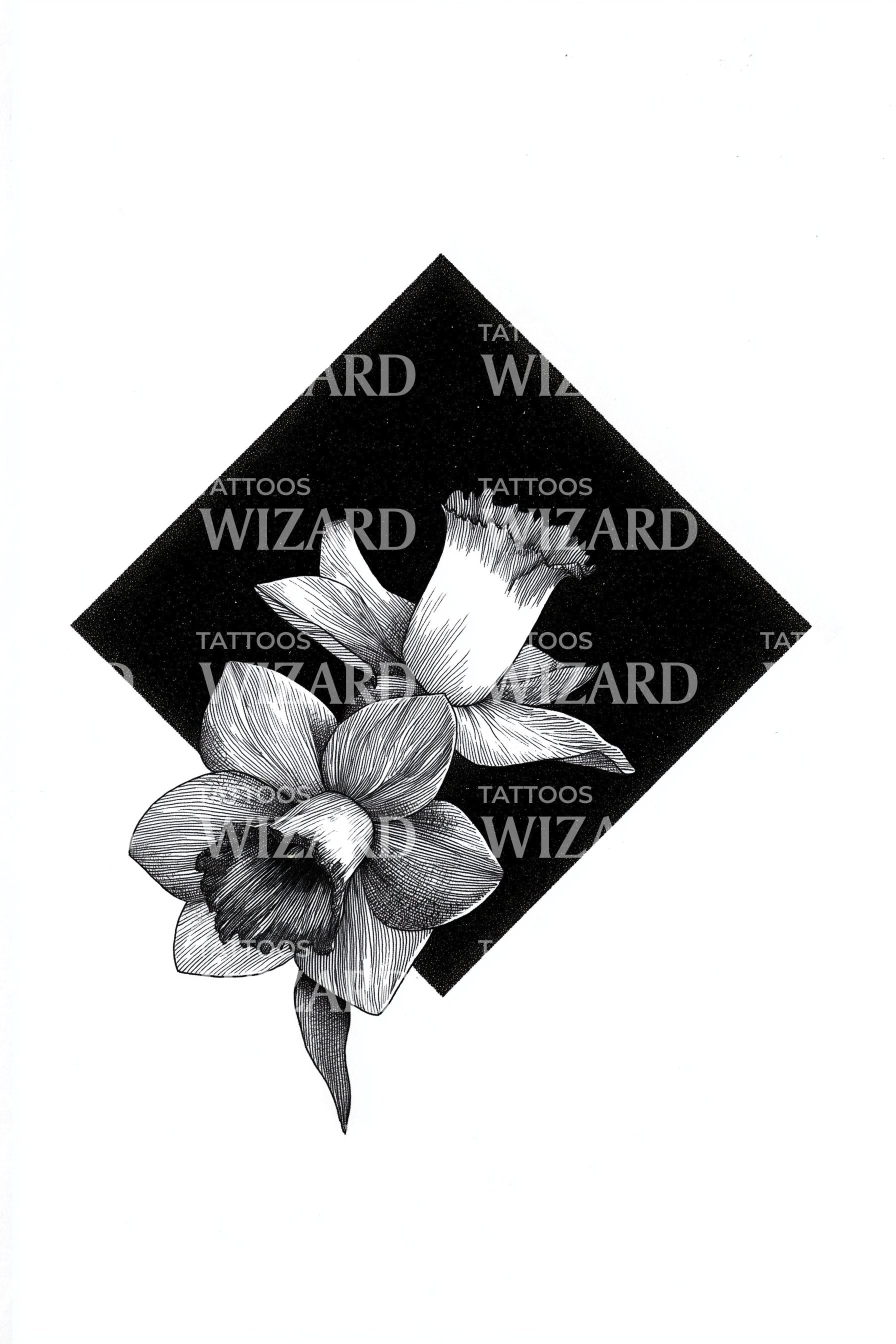 这款黑色纹身设计展现了令人惊叹的美学结合。负空间的水仙花优雅地环绕着精心设计的钻石,呈现出自然与魅力的独特融合。每一条线条和曲线都经过精心雕琢,完美适合追求传统与现代个性融合的人士。