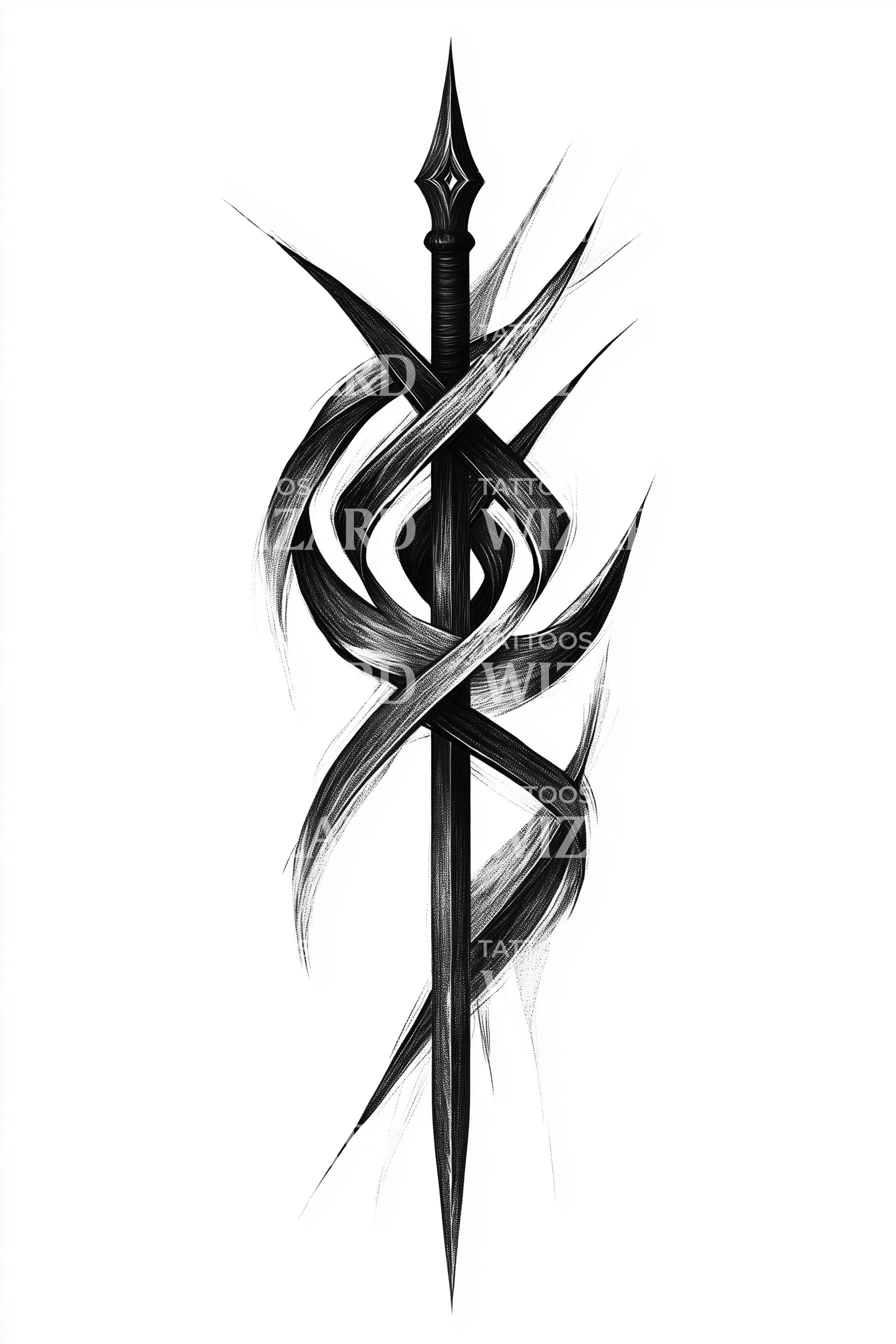 这款部落纹身设计巧妙融合了矛、符号和刀刃元素,打造出独特的图腾象征。以浓烈的黑色渲染,呼应古老的传统与勇气。非常适合那些寻求蕴含深厚部落精神并体现原始战士气概的设计的人士。
