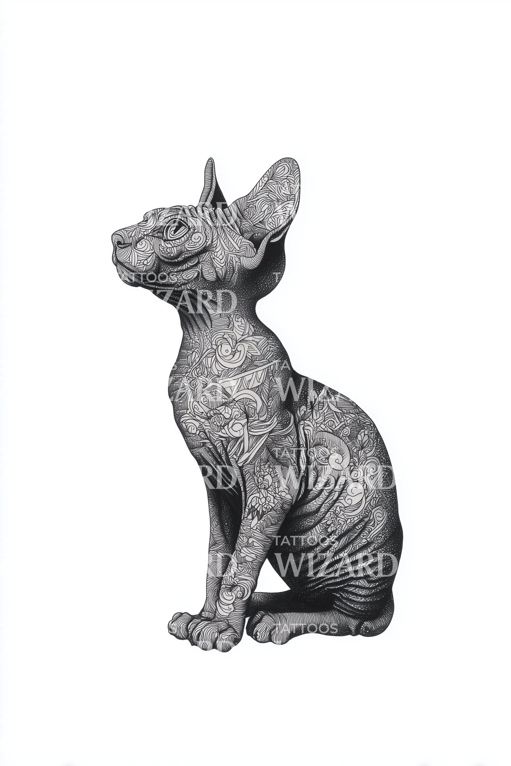 沉浸于这款无毛猫小猫纹身设计的精致细节中。以惊艳的素描风格呈现,展现了这只心爱宠物独特的花纹和神秘的轮廓。非常适合任何寻求个性、充满好奇且设计精巧作品的猫咪爱好者。