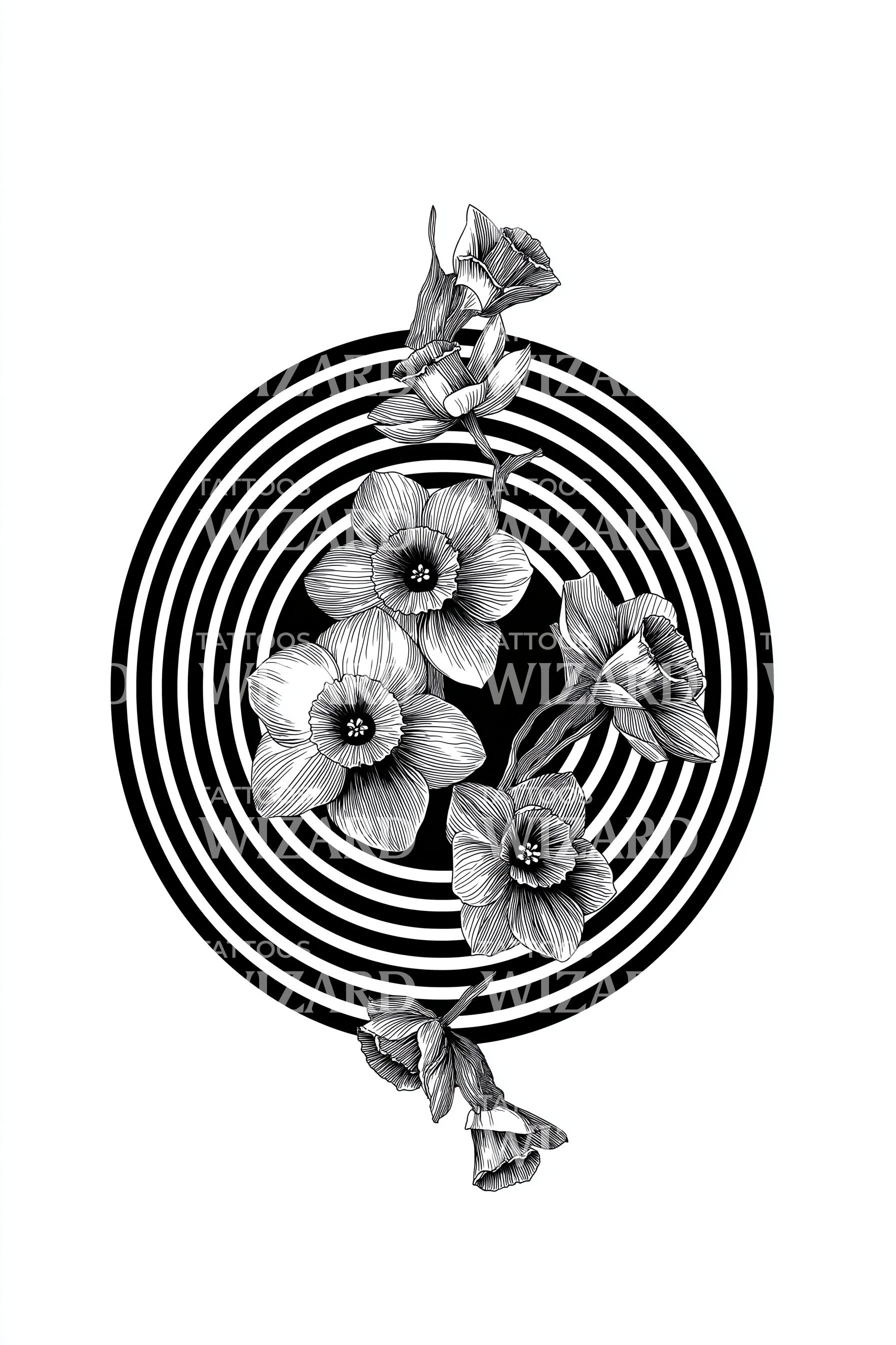沉浸于这款黑灰纹身设计带来的视觉之旅。我们现代的螺旋主题作品呈现出引人入胜的幻觉,巧妙地将花卉图案融合成迷人的图案。这幅引人注目的作品是对单色身体艺术神秘之美的戏剧性颂歌。