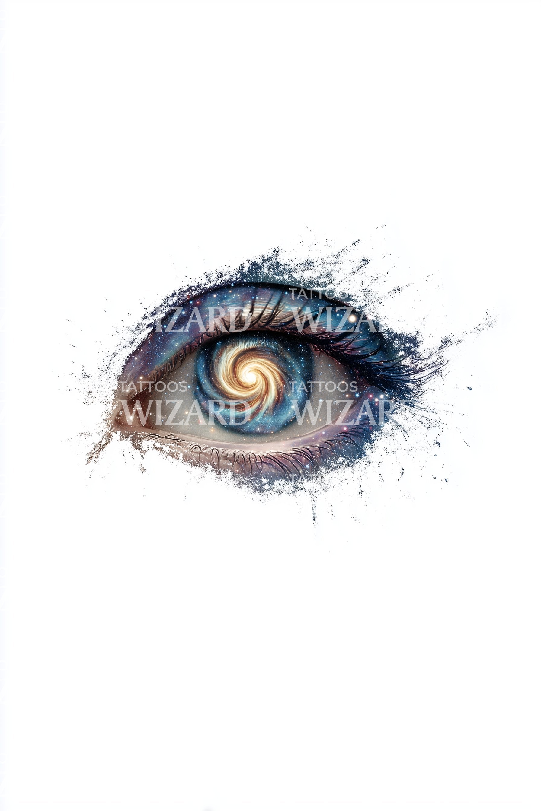 沉浸于宇宙神秘魅力的迷人纹身设计中。采用鲜艳的水彩渲染,描绘出螺旋星系中的宇宙之眼,象征深邃的视野与超凡的神秘感。此设计是对宇宙神秘之美的震撼颂歌。
