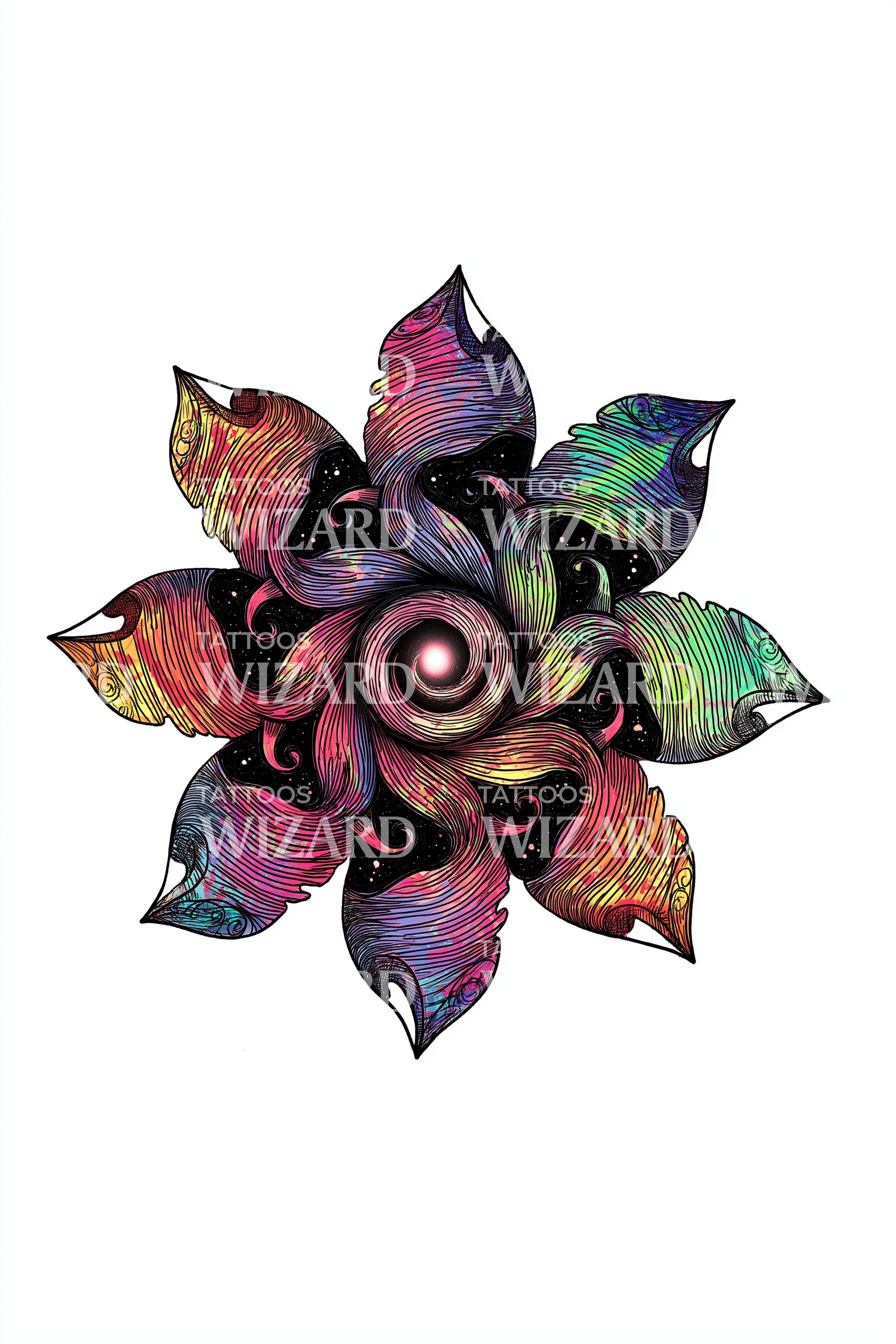 这款充满活力的新传统纹身设计体现了迷幻艺术的精髓。中心图案是一朵色彩斑斓的莲花,周围环绕着迷人的螺旋图案,营造出一个迷人的色彩池。其花卉主题是一场视觉盛宴,捕捉了自然的精致美丽与生机勃勃。对于热爱色彩丰富、细腻艺术的人来说,这是完美的纹身选择。