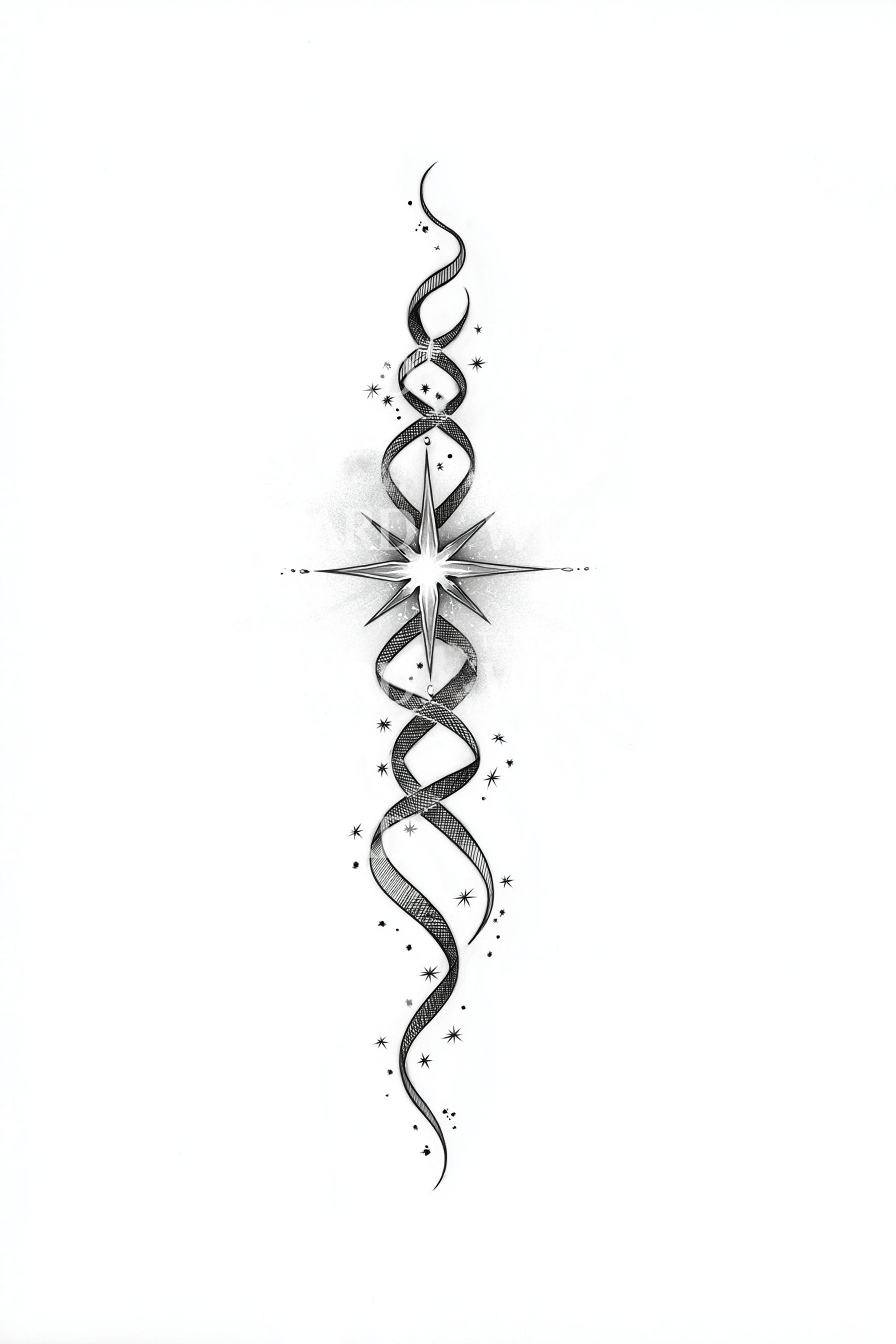 Spiraling ink ribbons climb a central eight-pointed star, balanced in elegant symmetry and soft stardust. A totem of renewal, the spiral evokes life’s continuum; the star, inner navigation. In deep black ornament, the flow settles the spirit, inviting calm courage and purposeful movement through change with grounded presence.