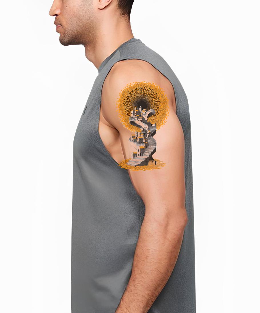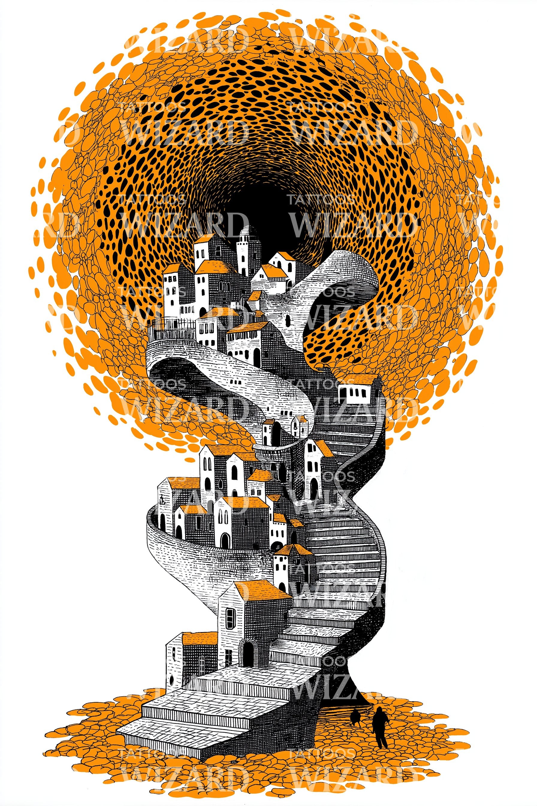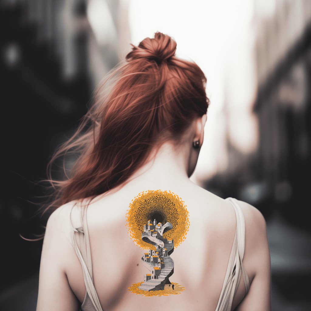 沉醉于这款超现实纹身的精致复杂设计。它展现了一个引人入胜的插画风格,融合了盘旋的小径和梦幻橙色调的田园山村。令人着迷地体现了宁静与旅行渴望,激发对风景之美的深刻赞赏。