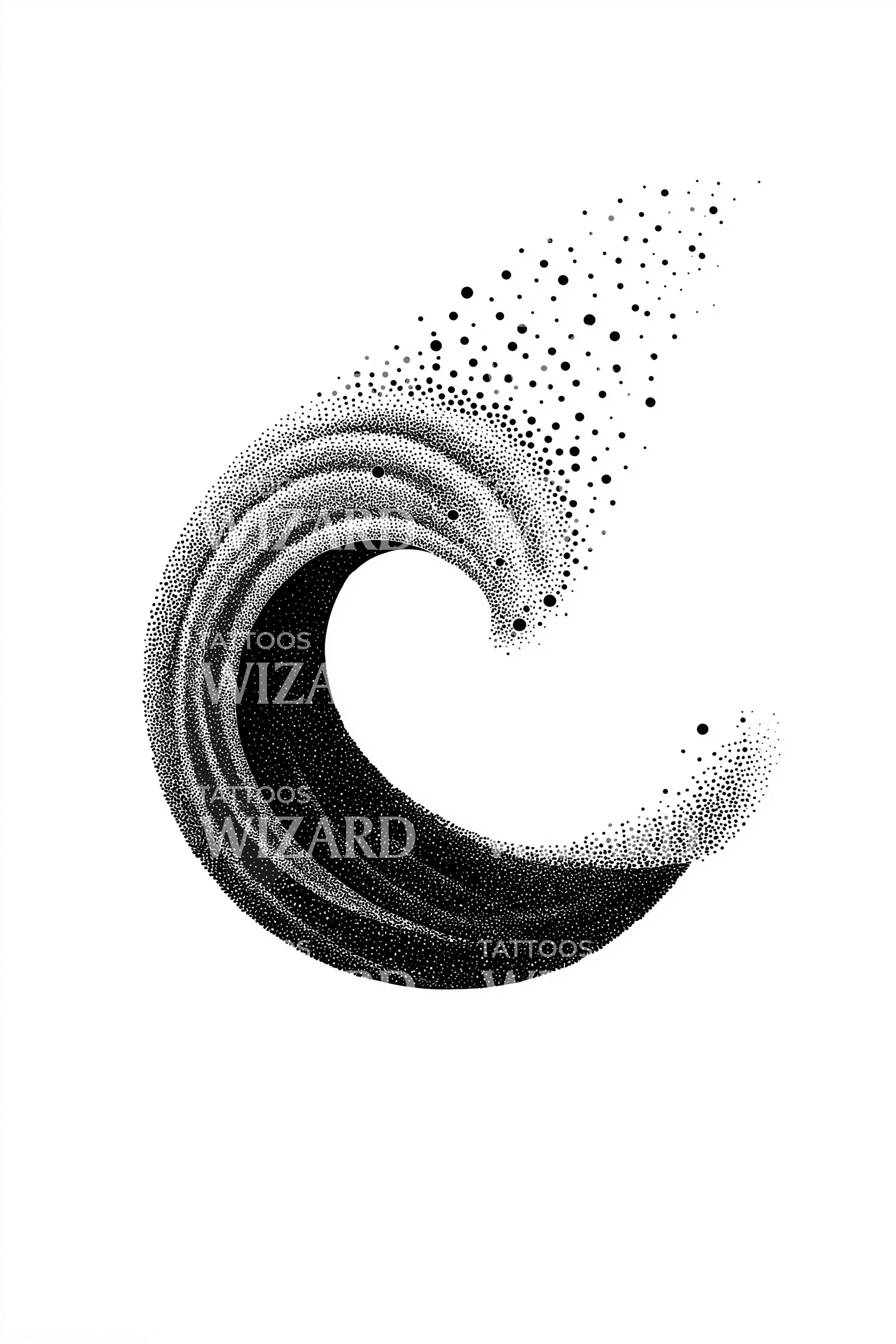 Stippled blackwork wave curls into a minimal spiral, its spray dissolving into drifting dots and clean white space. The sea’s endless swirl symbolizes renewal, resilience, and return to center. Wearing it feels like tide-borne breath steadying the heart, a quiet compass of motion, surrender, and strength.