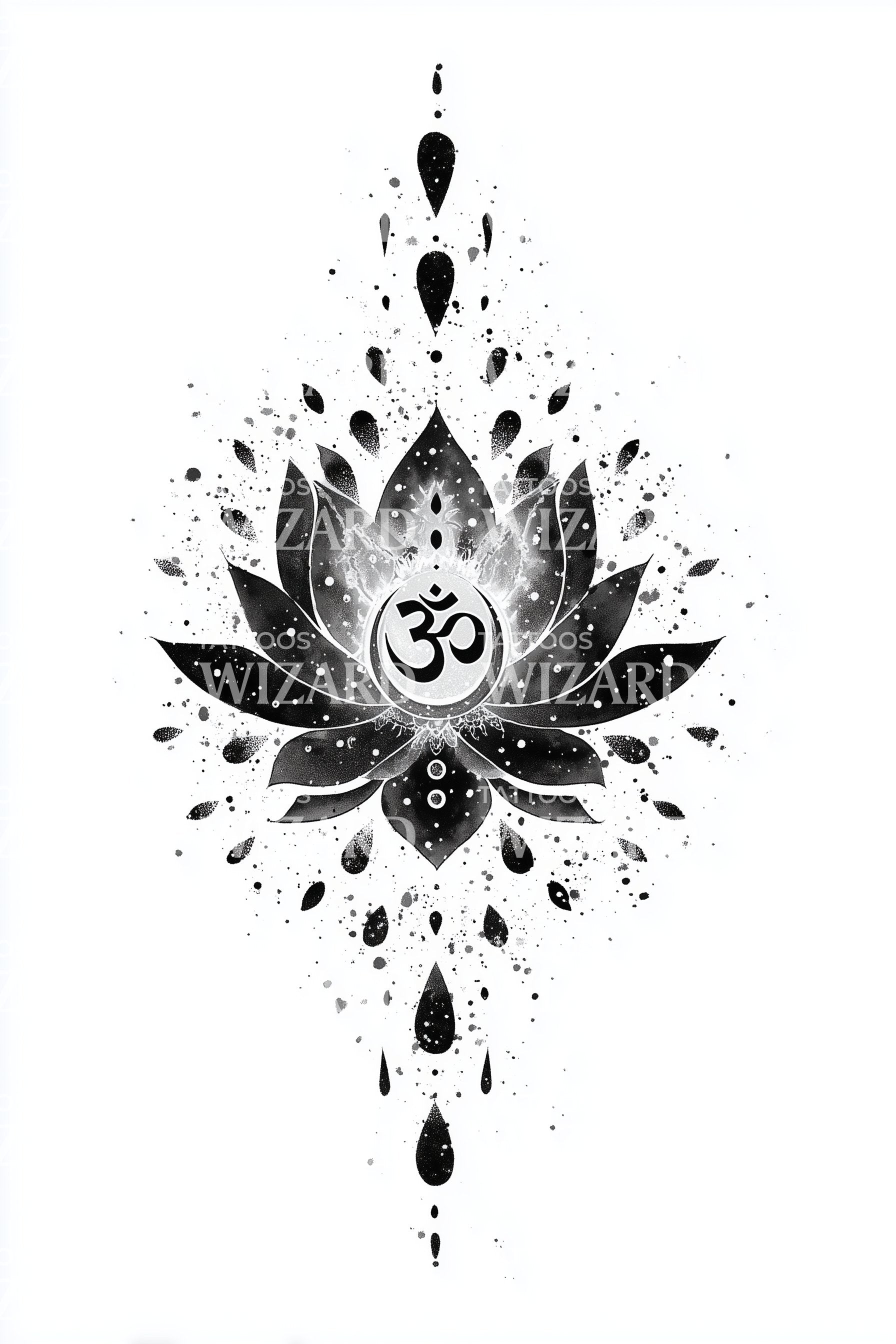 沉浸于这款黑灰纹身设计带来的精神宁静。以神圣的“om”符号为中心,环绕着精致的莲花和墨迹飞溅,散发出禅意氛围。这一引人注目的组合,时刻提醒你内心的平和与和谐,铭刻于肌肤之上。