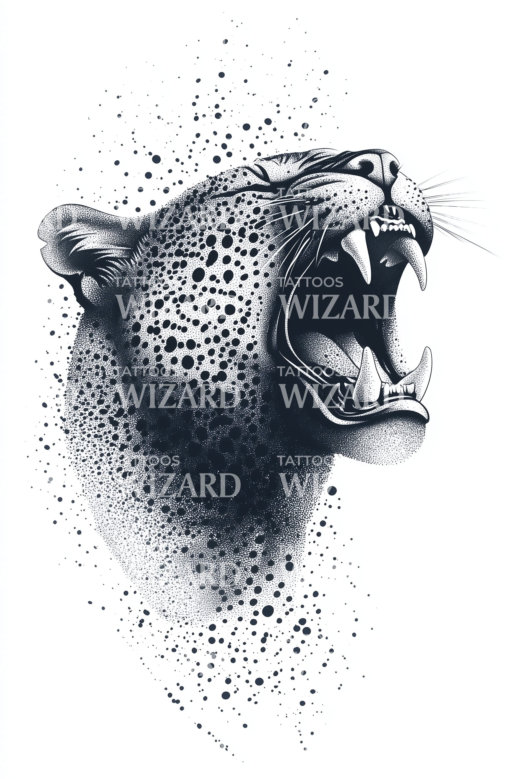 展现你狂野的一面,这款令人惊叹的点描纹身设计,精心描绘了渐变色调中咆哮的豹子。复杂的猎豹斑点巧妙融合,捕捉了野性的原始力量和不羁精神。这是一件真正引人入胜的作品,赞美大自然中最快掠食者的威严。