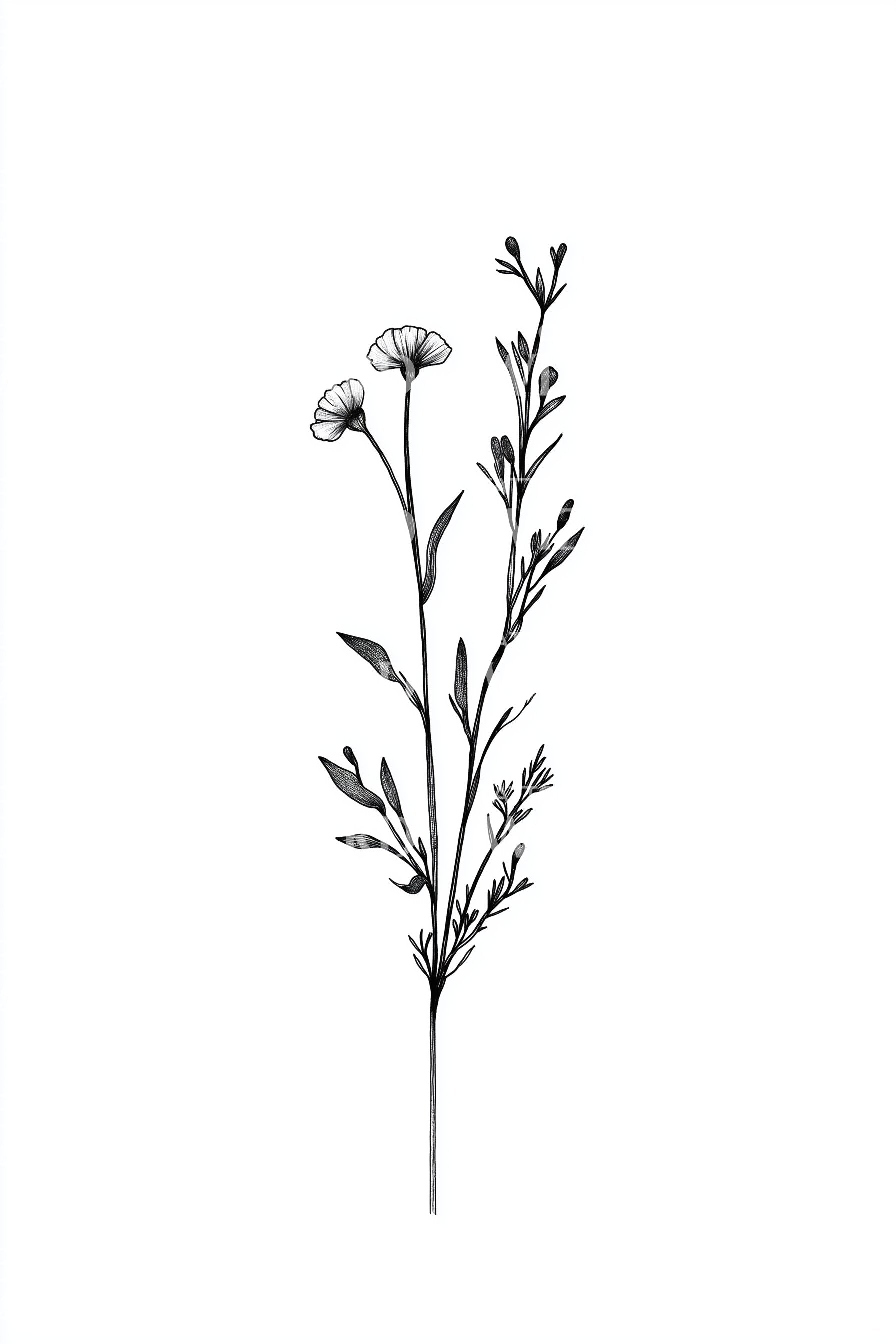 这款精致的细线纹身设计展现了大自然的精巧之美。以一枝植物草本为主题,设计优雅地交织线条,捕捉植物的脆弱与细节。非常适合喜爱极简和草本美学的你。