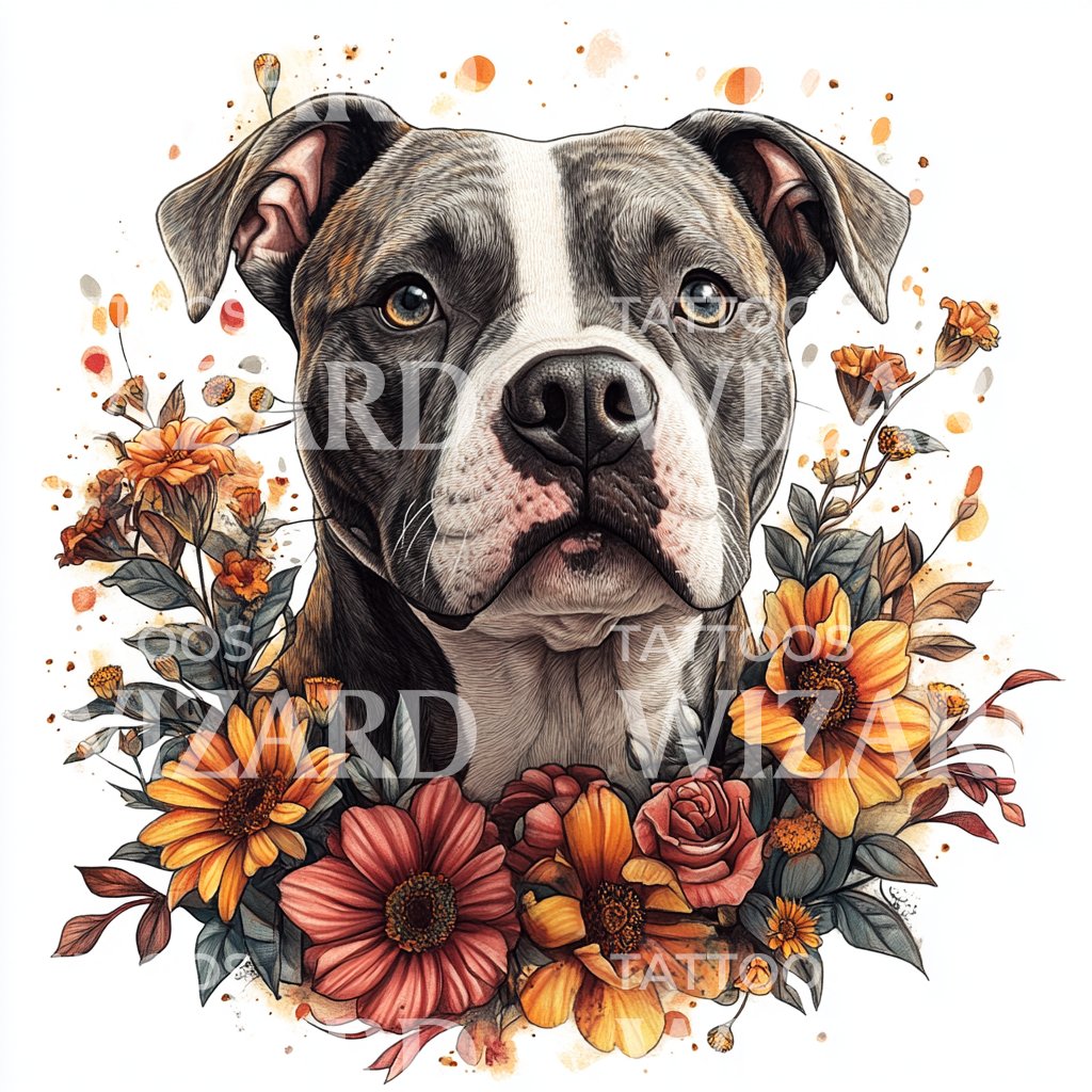 忠诚的斯塔福郡犬与花卉装饰纹身设计
