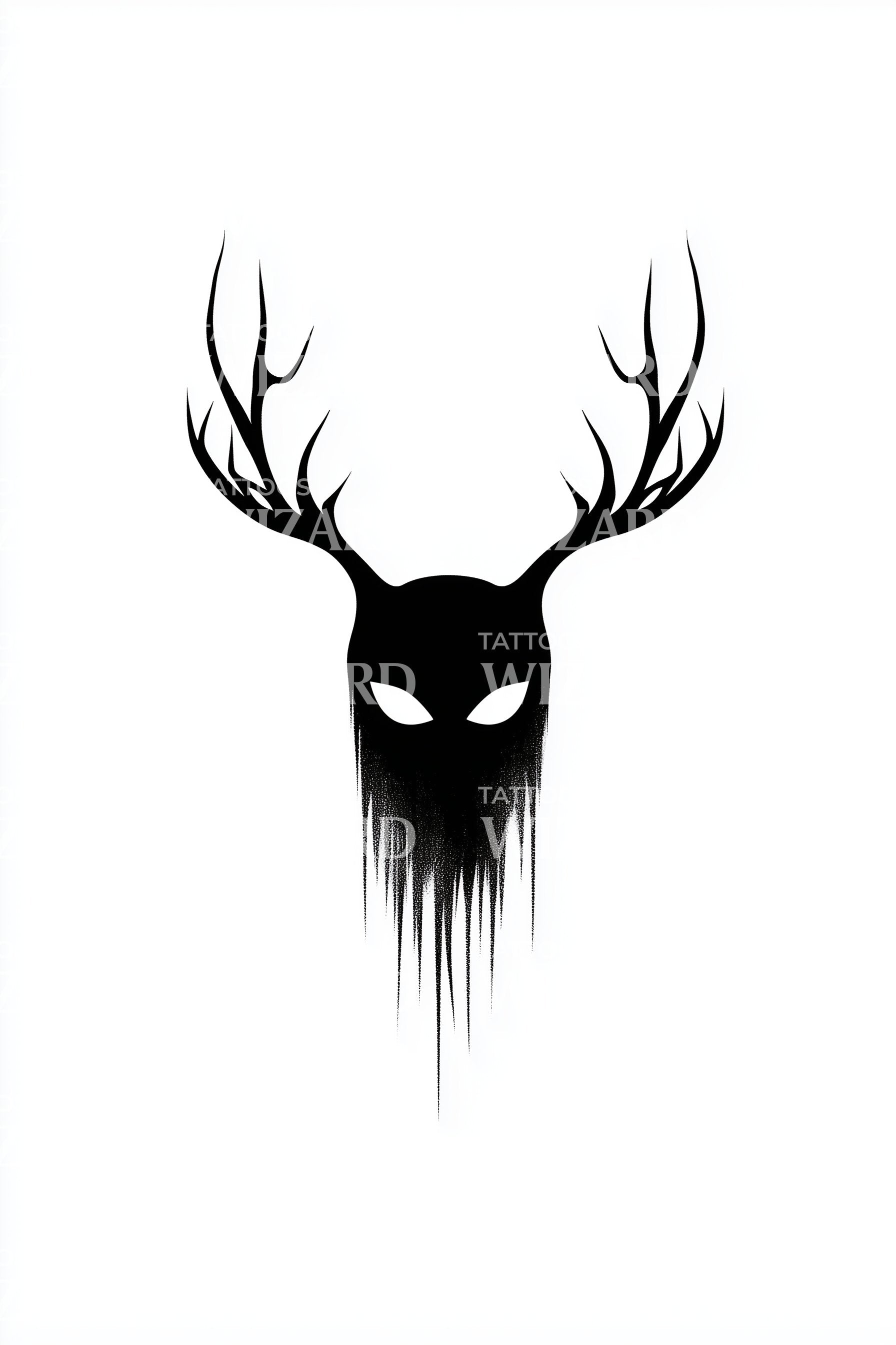 经典黑色纹身,雄鹿头部以鲜明的剪影呈现,鹿角向天空分枝,面部如面具般融入森林阴影。鹿角象征着野性,代表警觉、智慧与重生。佩戴如同静谧的力量与神秘。理想位置:前臂或小腿以展现垂直流动感,胸骨处彰显中心力量,上背部展现宽广气势。