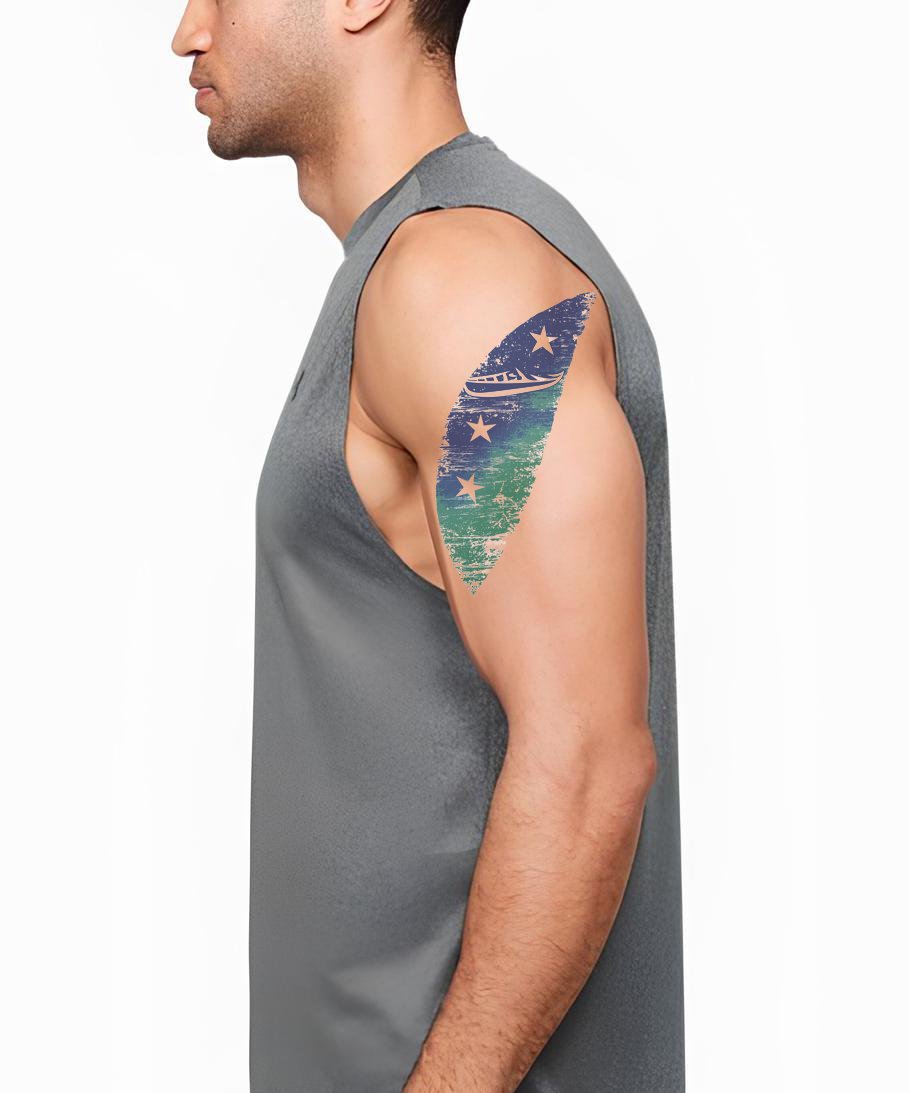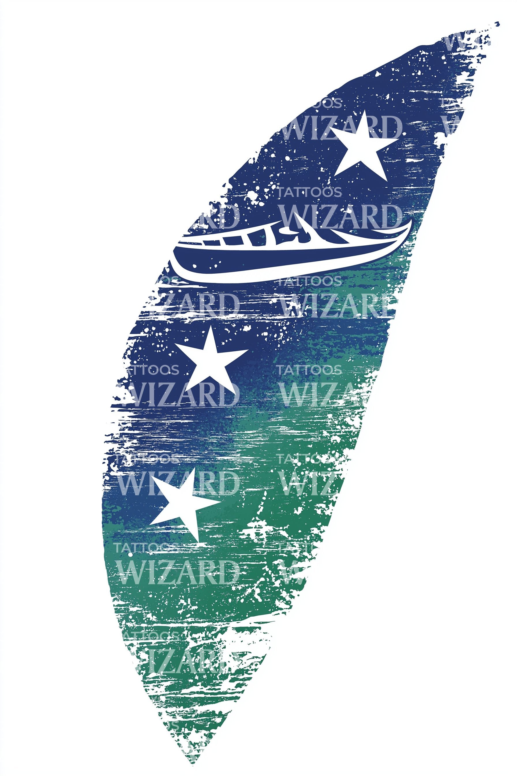 沉浸于这款水彩纹身设计独特的艺术融合,展现迷人的羽毛、闪烁的星星和壮丽的岛屿景色,全部融汇于和谐的蓝绿色调中。它以标志性的旗帜元素精细收尾,增添象征意义。以鲜明优雅脱颖而出!