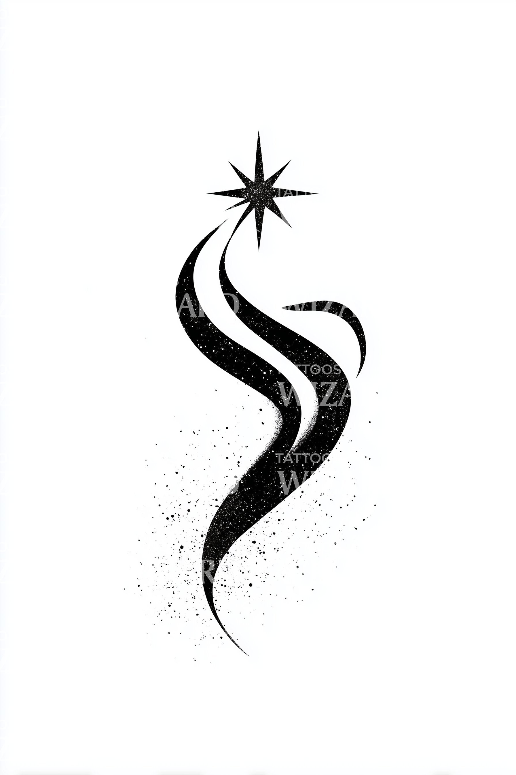 An elegant, minimal sigil: bold black swooshes rise in a clean curve toward an eight-point star, dusted with subtle splatter. The abstract flow channels energy and intention, a compass for growth and clarity. Worn on skin, it feels like breath lifting, steady confidence, silent momentum, luminous direction.