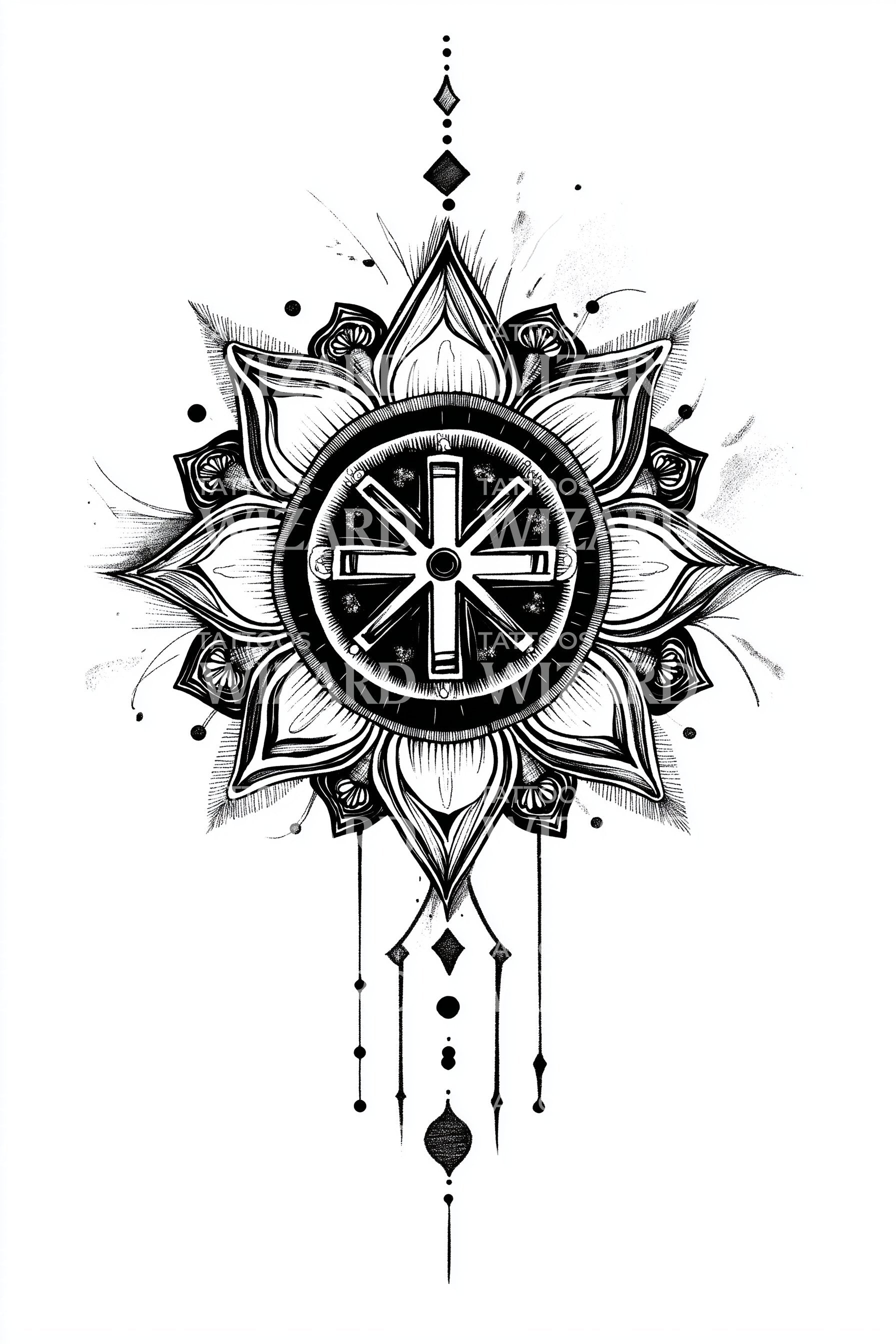 这款装饰性纹身设计巧妙地结合了指南针和十字架,二者均象征着指引与信仰。星芒的几何图形和浓烈的黑色增添了层次感,使其成为一件引人注目的作品。非常适合欣赏复杂且富有意义艺术作品装饰肌肤的您。