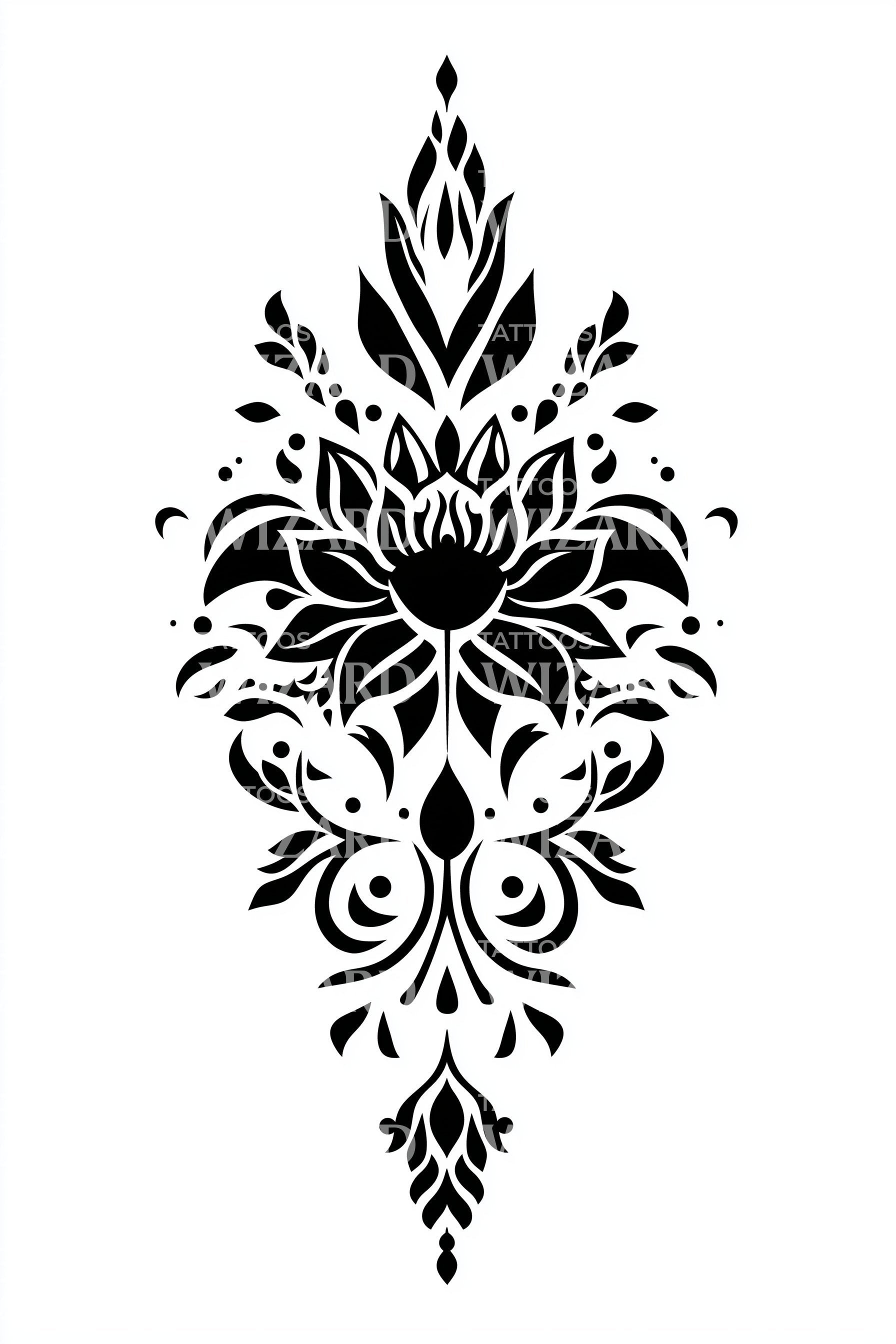 体验自然与几何的神圣结合,这款耀眼的黑色纹身设计。展现华丽的莲花与对称的星爆图案优雅地并置,真正体现了装饰美。它是光辉与神秘的完美融合,为你的身体画布增添深度。