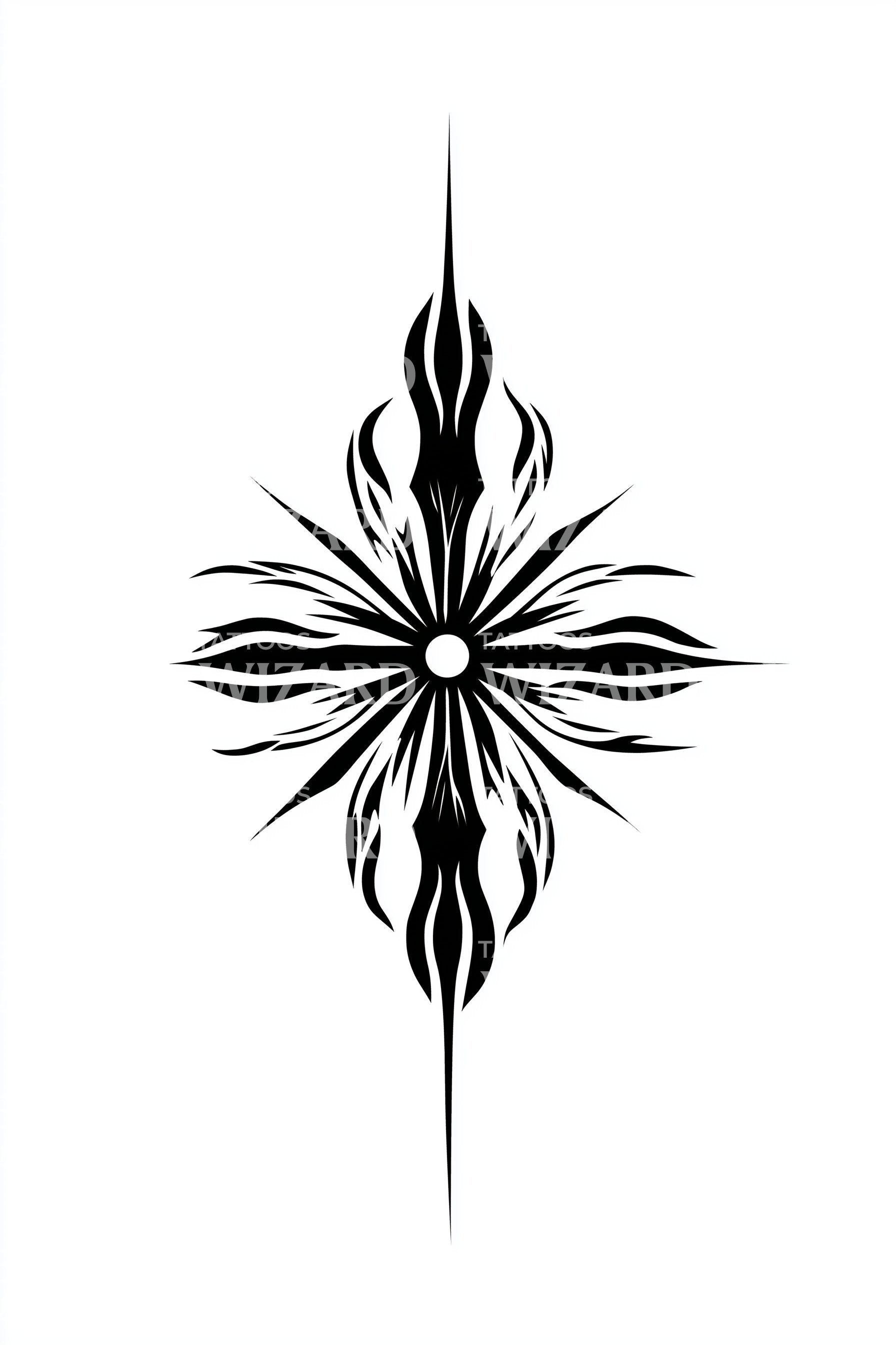 这款纹身设计散发着美感,将装饰性元素与抽象的对称星爆图案相结合。采用纯黑色墨水完成,增添了前卫的气息。非常适合欣赏对称魅力和鲜明大胆黑色墨水艺术的人士。
